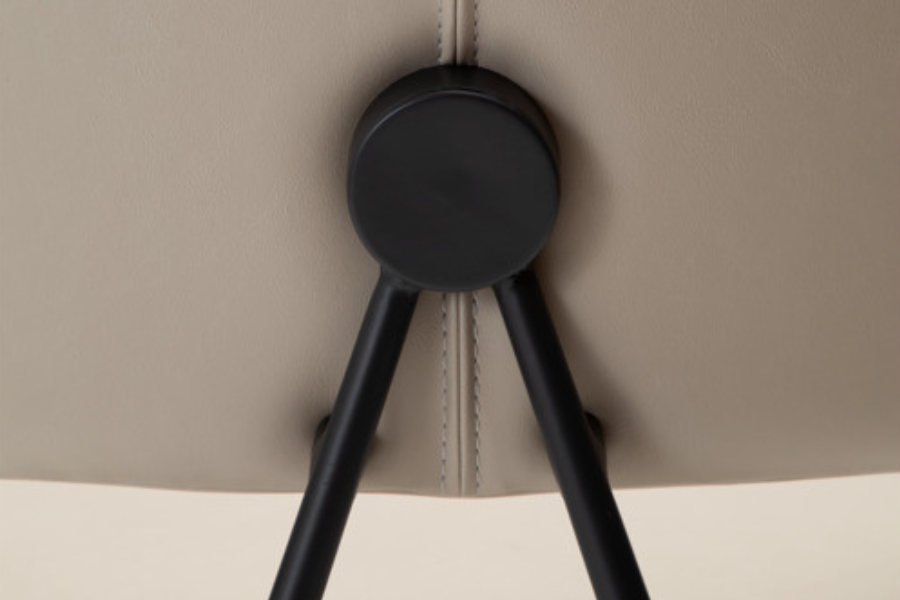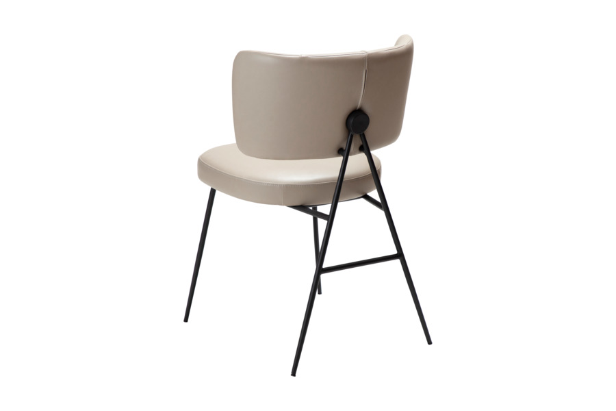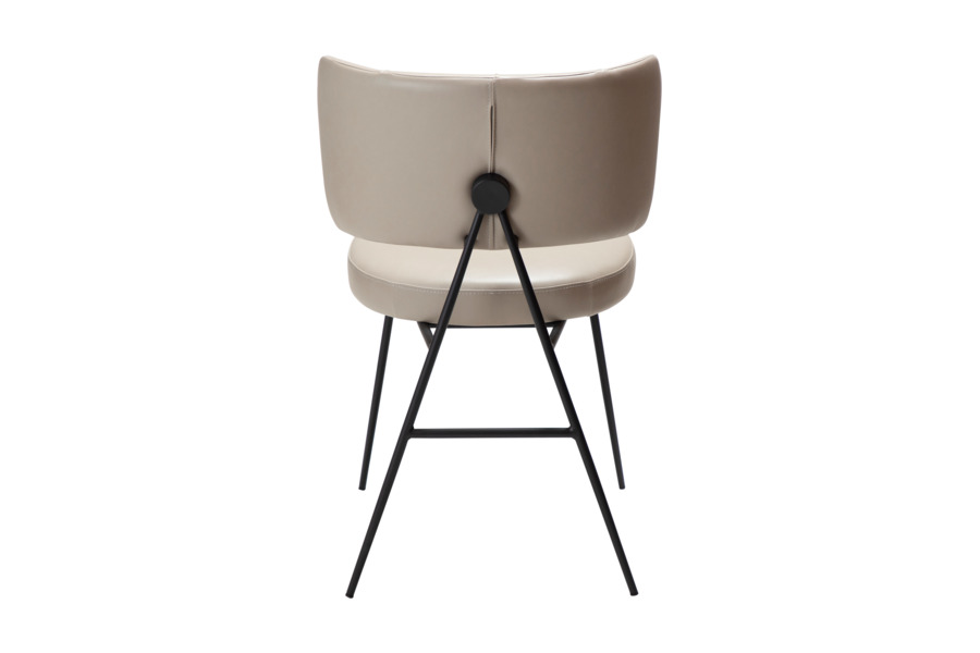Ιδιαίτερο design στοιχείο αποτελεί η εμφανής μεταλλική στήριξη στο πίσω μέρος της πλάτης, η οποία προσδίδει χαρακτήρα και διαφοροποιεί την καρέκλα από τα κλασικά μοντέλα. Ο μεταλλικός σκελετός σε μαύρο φινίρισμα ενισχύει τη σταθερότητα, ενώ τα λεπτά πόδια διατηρούν την αισθητική minimal και ελαφριά.