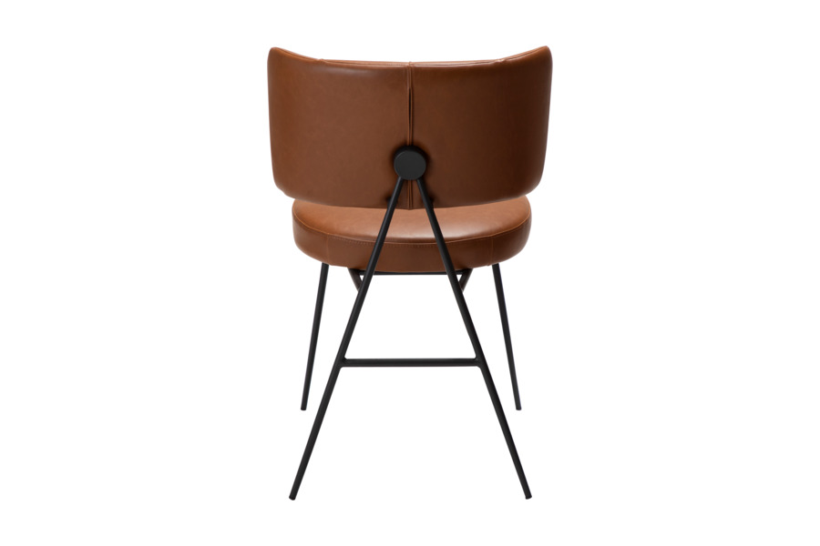 Ιδιαίτερο design στοιχείο αποτελεί η εμφανής μεταλλική στήριξη στο πίσω μέρος της πλάτης, η οποία προσδίδει χαρακτήρα και διαφοροποιεί την καρέκλα από τα κλασικά μοντέλα. Ο μεταλλικός σκελετός σε μαύρο φινίρισμα ενισχύει τη σταθερότητα, ενώ τα λεπτά πόδια διατηρούν την αισθητική minimal και ελαφριά.