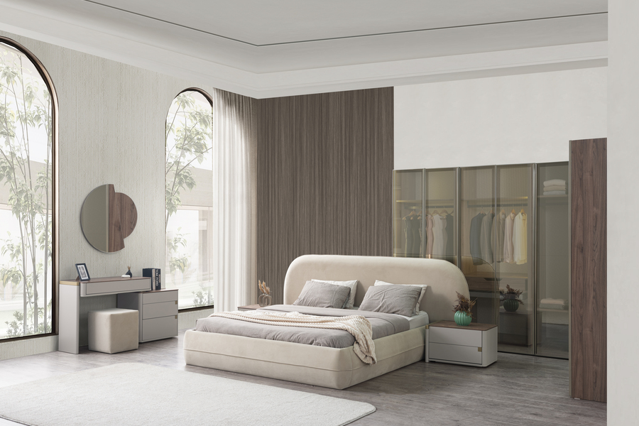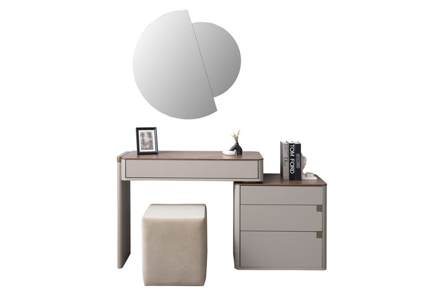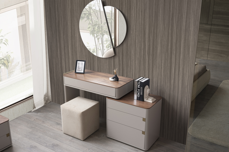 Η επιφάνεια σε φυσική απόχρωση ξύλου προσθέτει ζεστασιά, ενώ το σώμα του επίπλου σε ουδέτερους τόνους ενισχύει τη διαχρονικότητα του design. Τα συρτάρια προσφέρουν άνετο αποθηκευτικό χώρο για ρούχα και προσωπικά αντικείμενα, εξασφαλίζοντας οργάνωση και ευκολία στην καθημερινή χρήση.