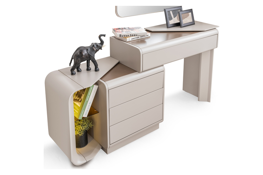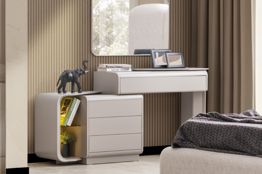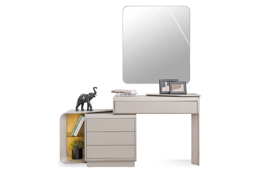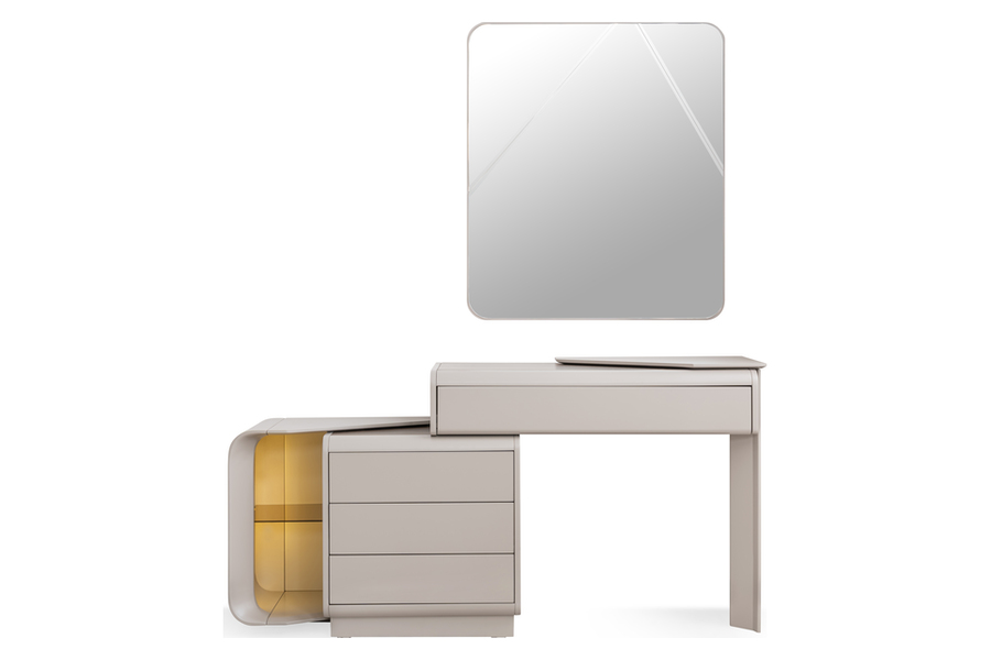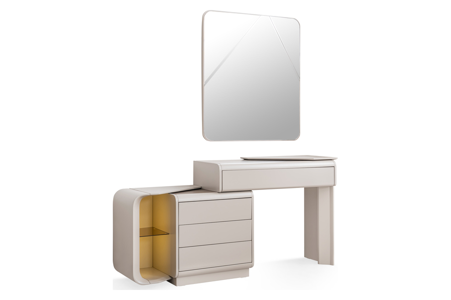 Διαθέτει ευρύχωρα συρτάρια που προσφέρουν άνετο αποθηκευτικό χώρο για ρούχα, αξεσουάρ και προσωπικά αντικείμενα, ενώ το πλαϊνό ανοιχτό τμήμα με γυάλινο ράφι προσθέτει πρακτικότητα και στυλ.