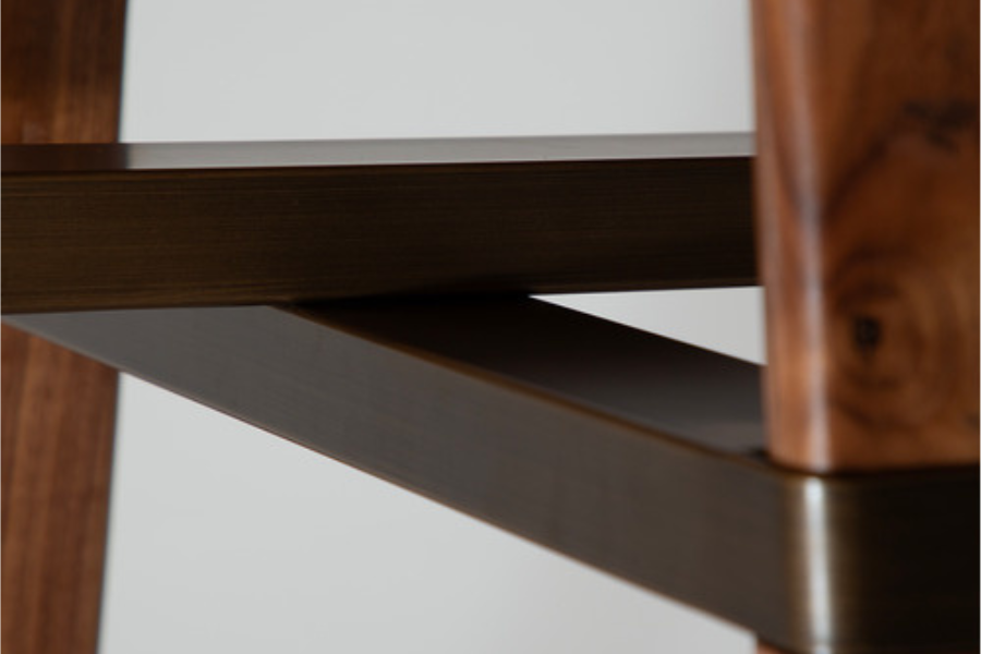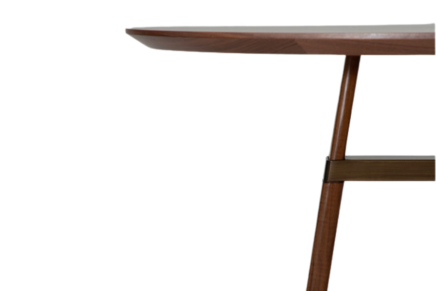 Η επιφάνεια με λοξή ακμή (bevelled edge) δημιουργεί μια αίσθηση ελαφρότητας, ενώ η βάση με τα χαρακτηριστικά διασταυρωμένα πόδια αναδεικνύει την υψηλή ποιότητα κατασκευής και τη λεπτομέρεια στις ενώσεις. Η στιβαρή δομή εξασφαλίζει σταθερότητα, ενώ η συνολική μορφή παραμένει κομψή και ισορροπημένη.