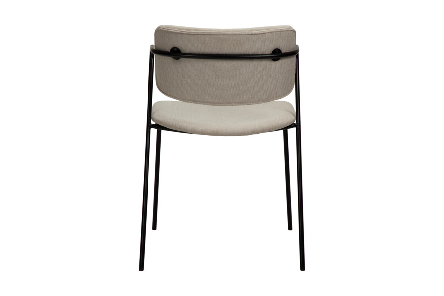Ο μεταλλικός σκελετός σε μαύρη απόχρωση παρέχει υψηλή αντοχή και σταθερότητα, ενώ τα λεπτά πόδια διατηρούν μία κομψή και ανάλαφρη οπτική παρουσία στον χώρο. Ο σχεδιασμός της επιτρέπει εύκολο συνδυασμό με ποικιλία τραπεζιών και διακοσμητικών στυλ.