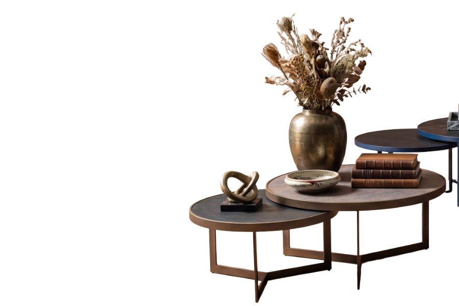 The Mercedes coffee table set stands out for its minimalist design and perfect balance between aesthetics and practicality. Its tops are made of HPL (High Pressure Laminate) in Retro Gold and Black Beton finishes, offering a modern touch with exceptional durability.