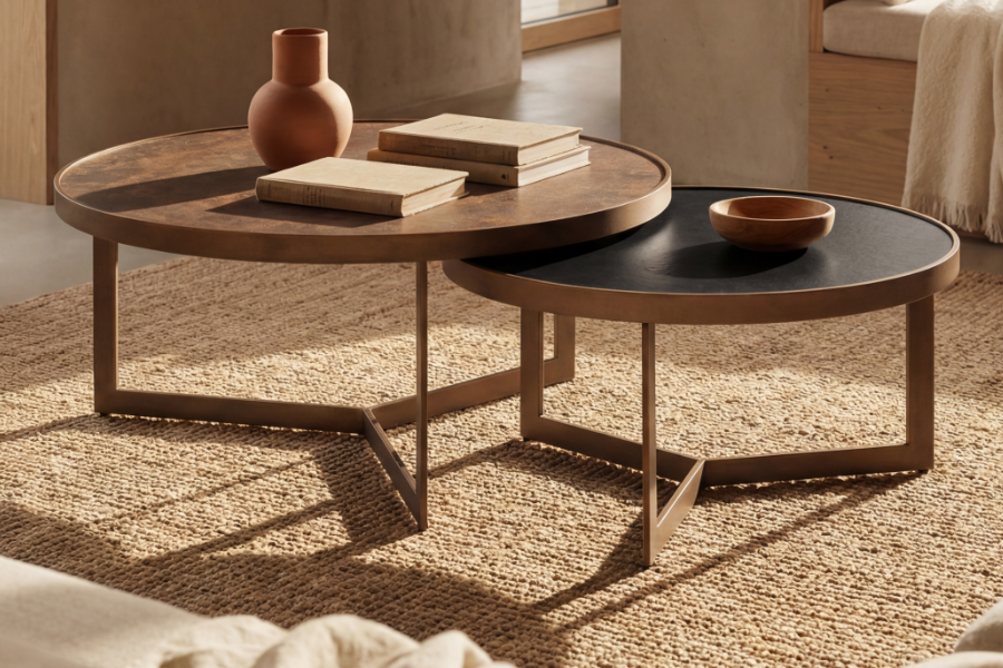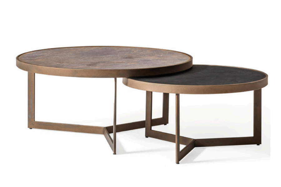 The tables measure Ø70x36h cm (small) and Ø90x42h cm (large), making them adaptable to various living room arrangements.