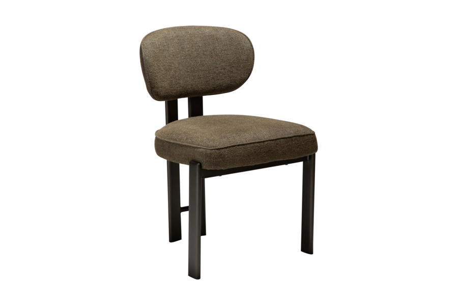 Upholstered in bouclé fabric in a deep olive tone, the chair adds warmth and sophistication to any dining space. The generously padded seat ensures exceptional comfort, while the metal frame provides durability and stability.