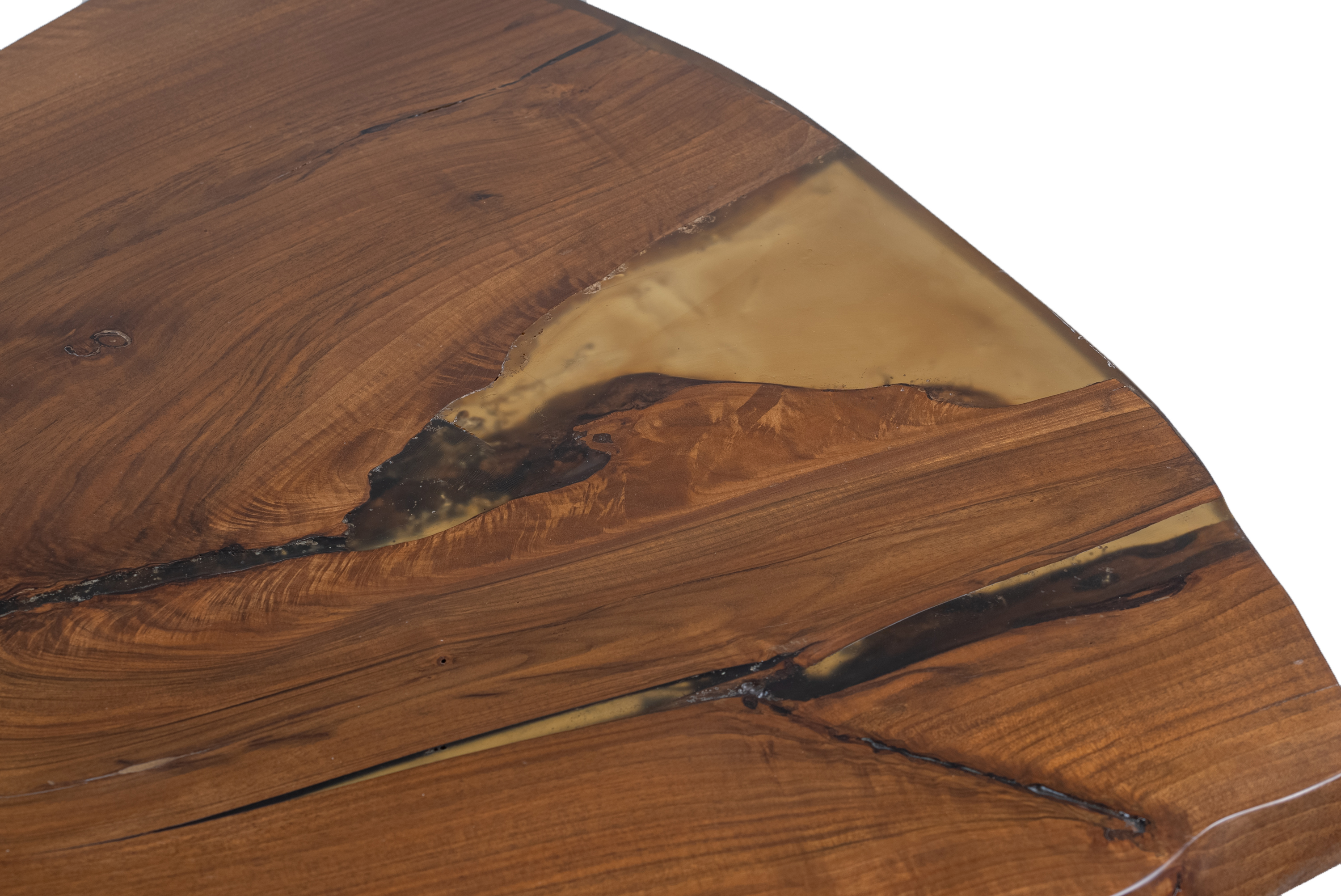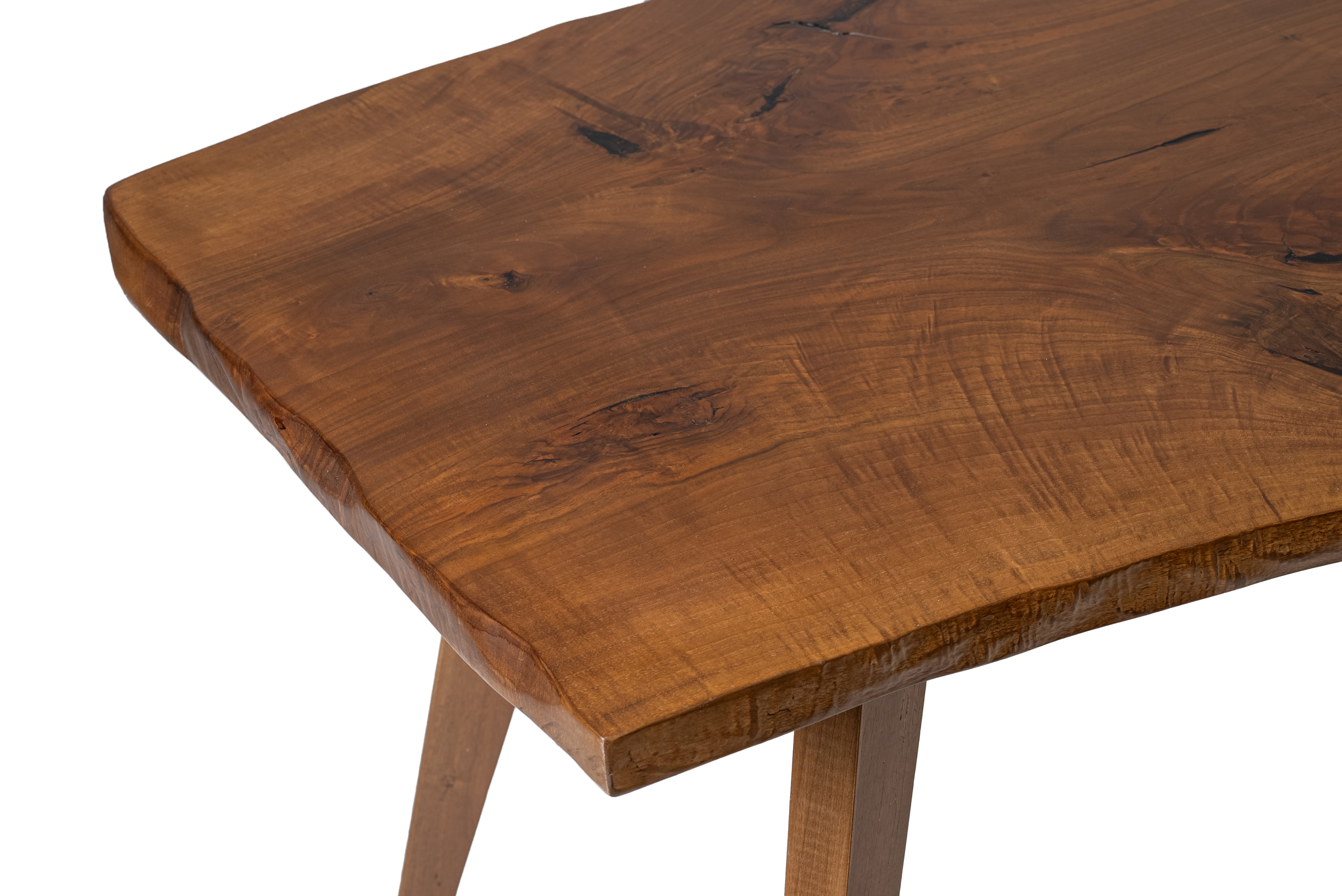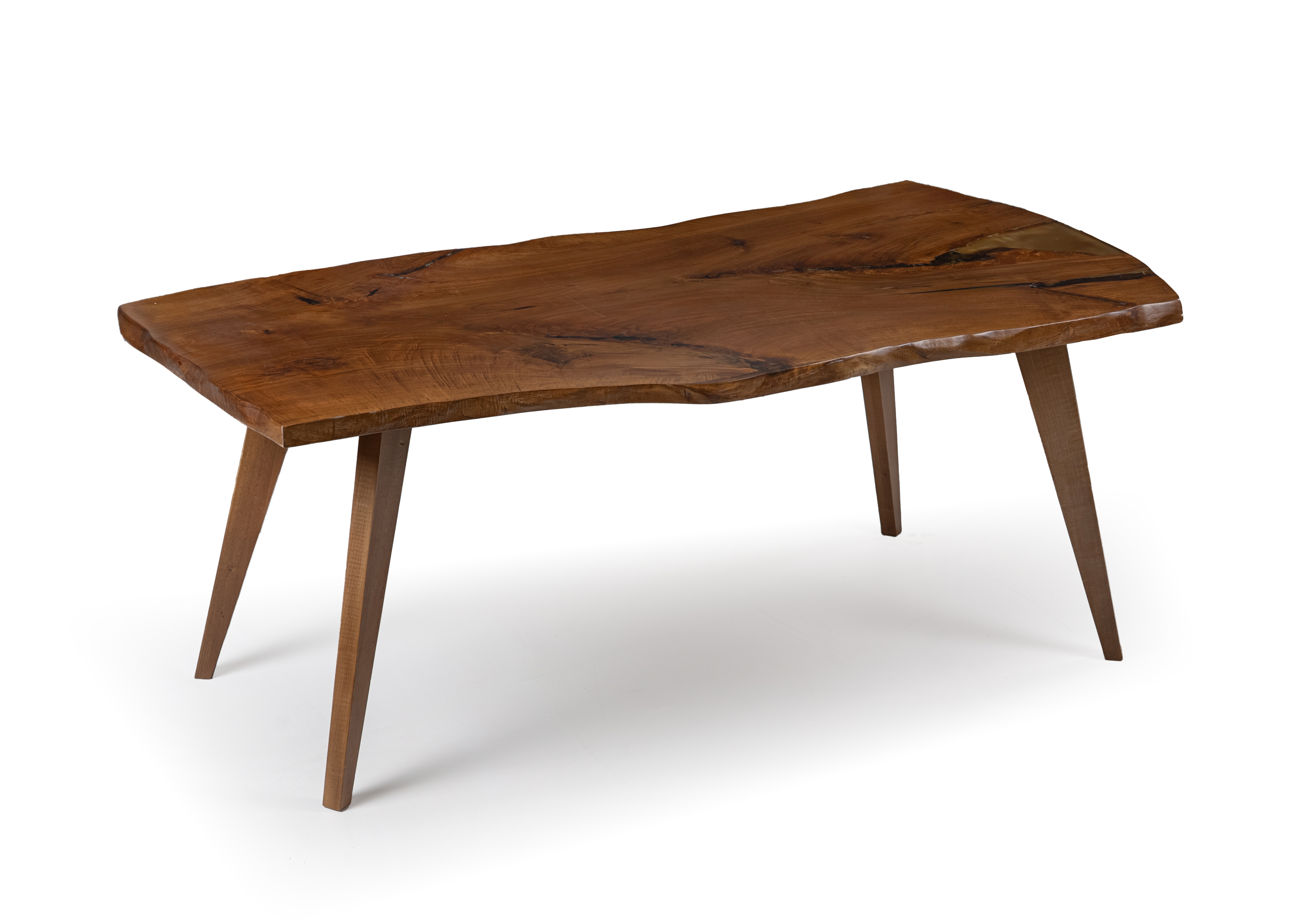 Handcrafted dining table made from premium solid walnut wood, featuring an organic design that highlights the natural grain, knots, and unique curves of the timber. Every piece is a one-of-a-kind creation, preserving the authentic form and character of the wood.