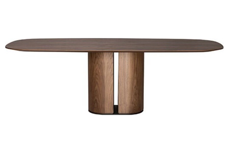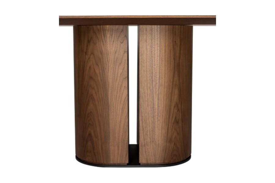 Its base consists of two cylindrical volumes that provide stability and architectural character. The symmetry and clean lines enhance the modern aesthetic of the table.