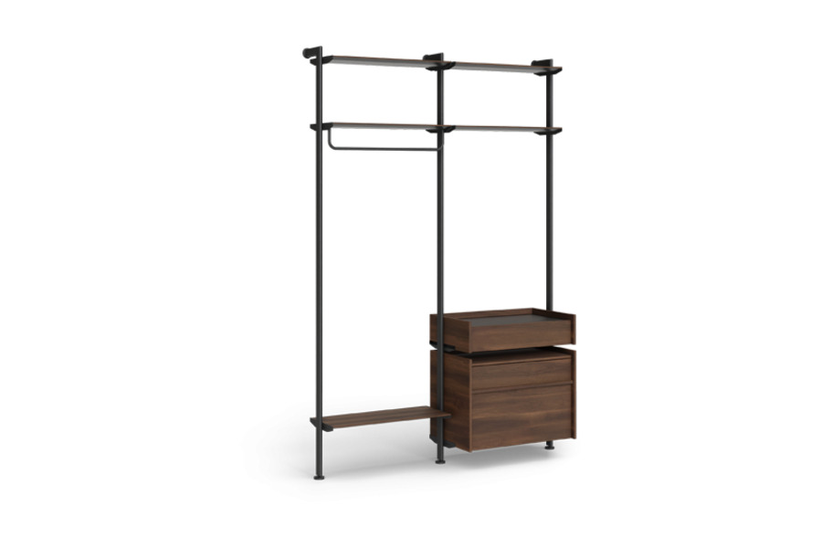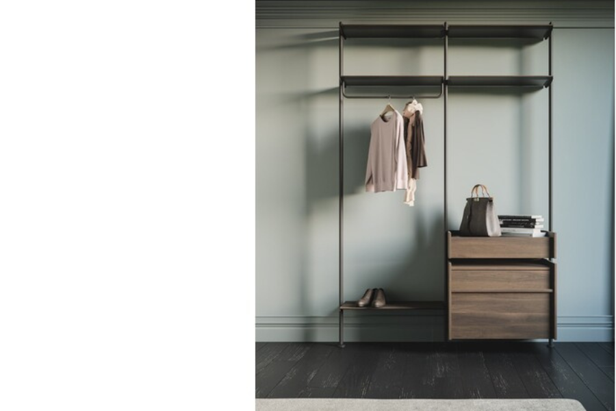 It features a hanging rail, shelves, and an integrated drawer, providing practical organization for everyday use.