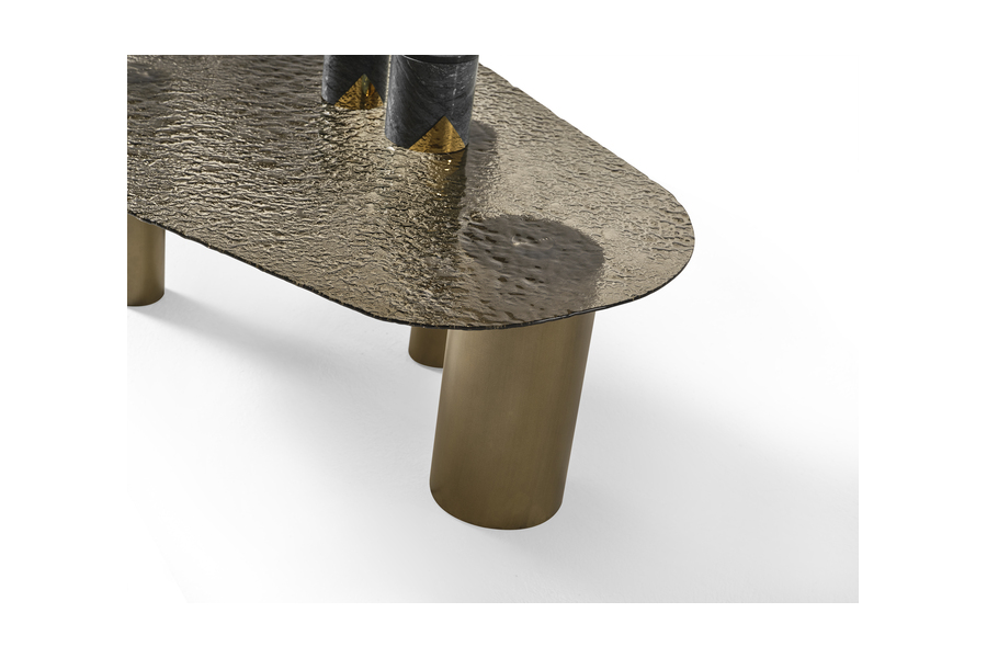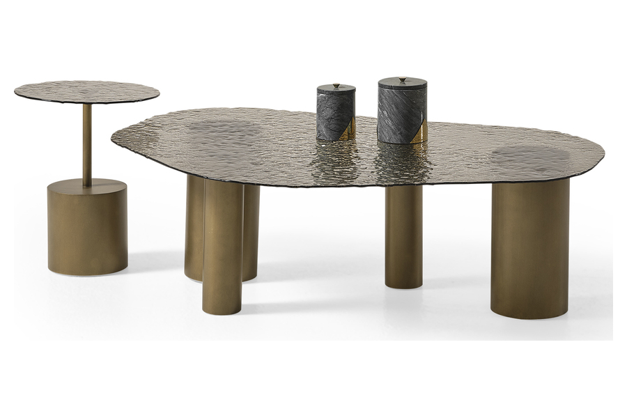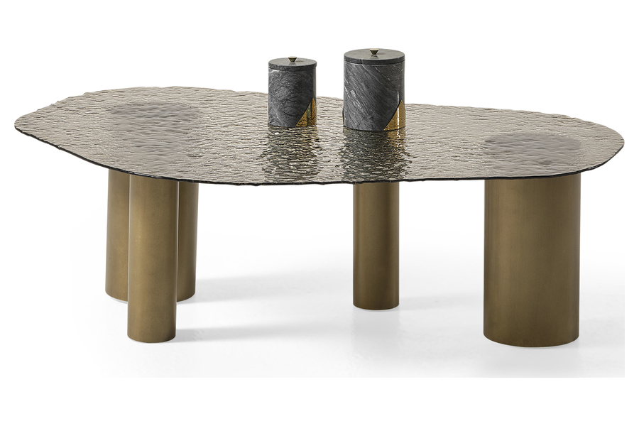 The base consists of cylindrical metal elements with a warm metallic finish, ensuring excellent stability while adding architectural interest. The combination of glass and metal results in a sophisticated and modern aesthetic.