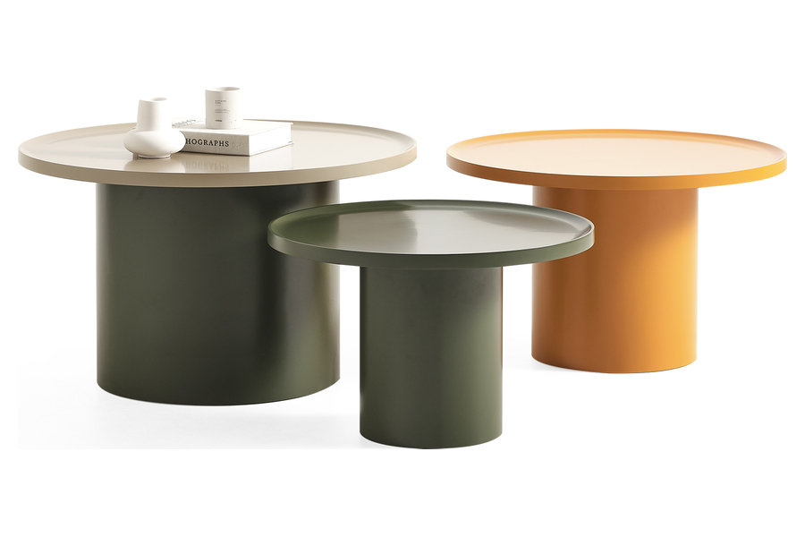 The tables are made of metal with a powder-coated finish, ensuring durability and a smooth matte texture. Available in multiple colors, they allow creative combinations and flexible interior styling.