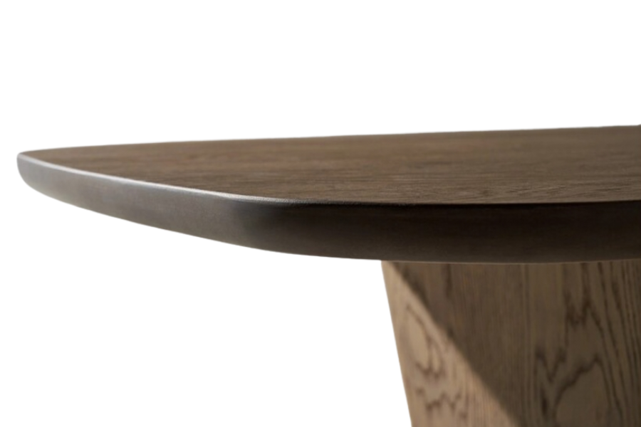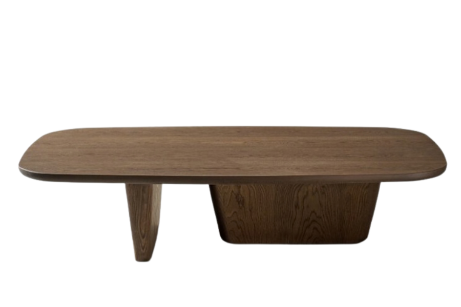 Its tabletop features an organic rectangular shape with rounded edges, creating a balanced and elegant appearance that fits perfectly in contemporary and minimalist interiors. The natural wood grain highlights the quality of the material while adding warmth and texture to the space.