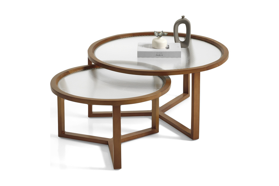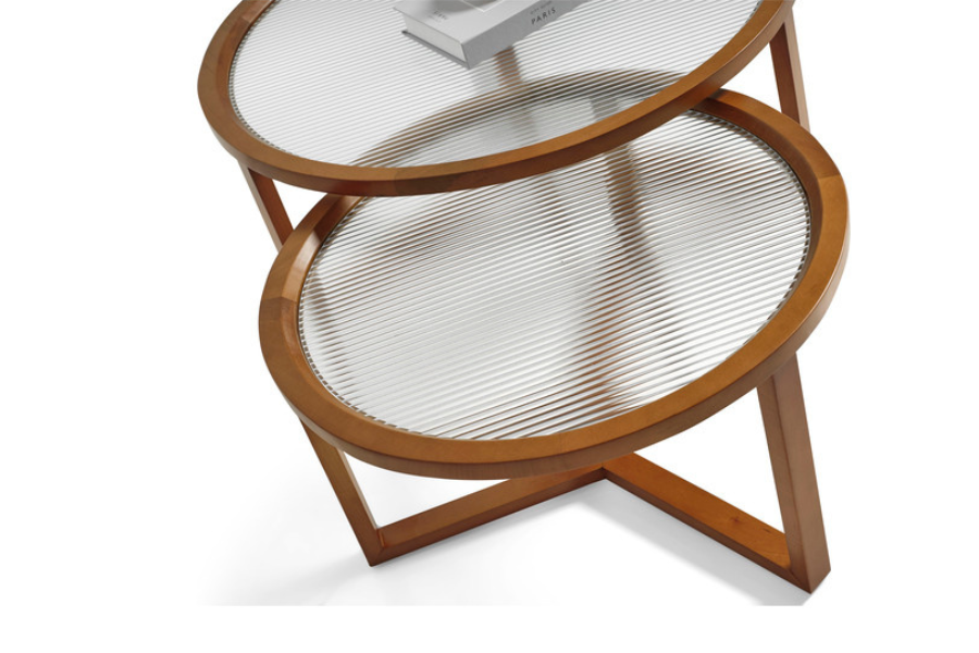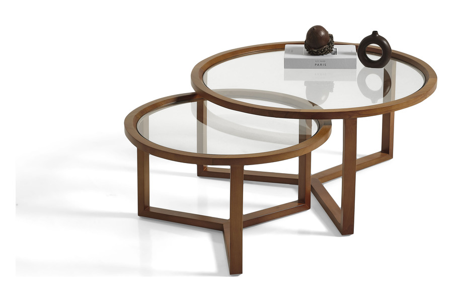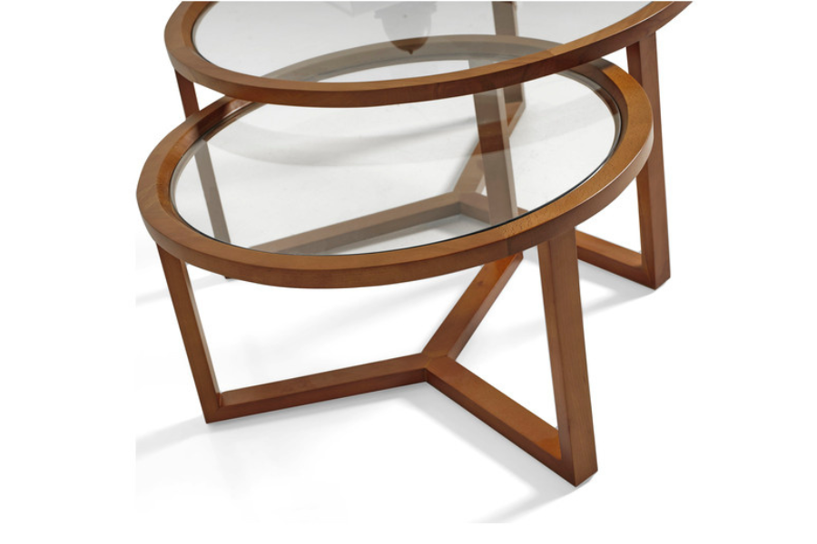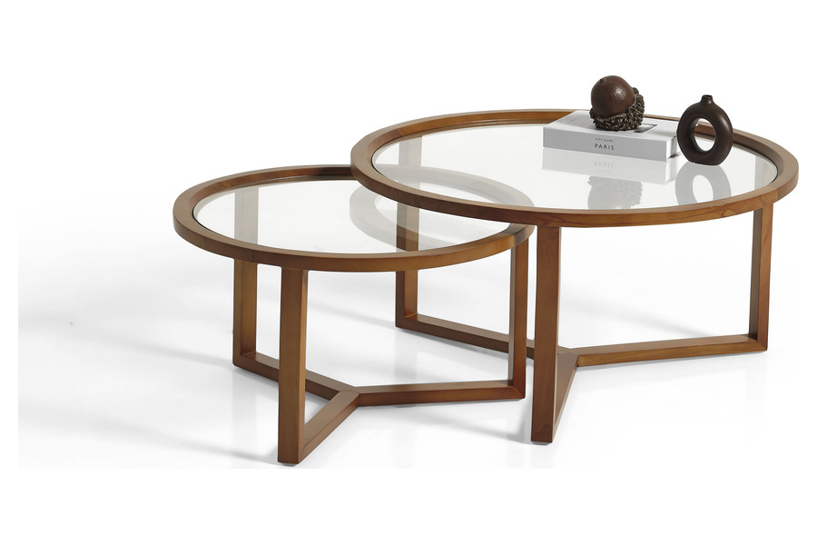The round glass top enhances brightness and visual lightness, while the wooden frame adds warmth, stability, and natural character. Its well-balanced design allows the tables to be used together or separately, offering flexibility in space arrangement.