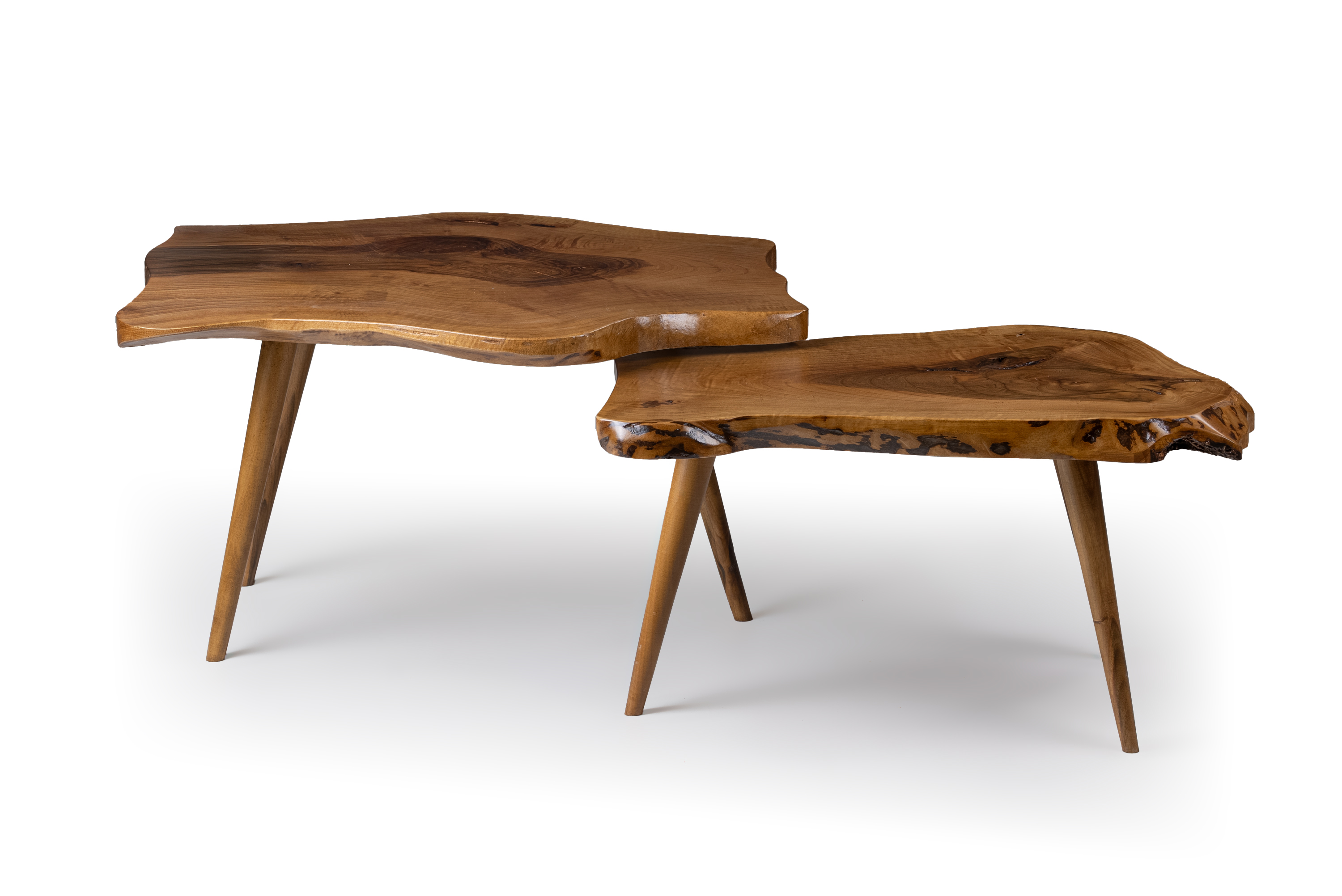 The Masif walnut 20 side tables set is a unique creation made from solid natural walnut wood, designed to highlight the authentic beauty of the material. Each piece is one of a kind, featuring organic curves, natural grain patterns, and details shaped by the tree’s original form.