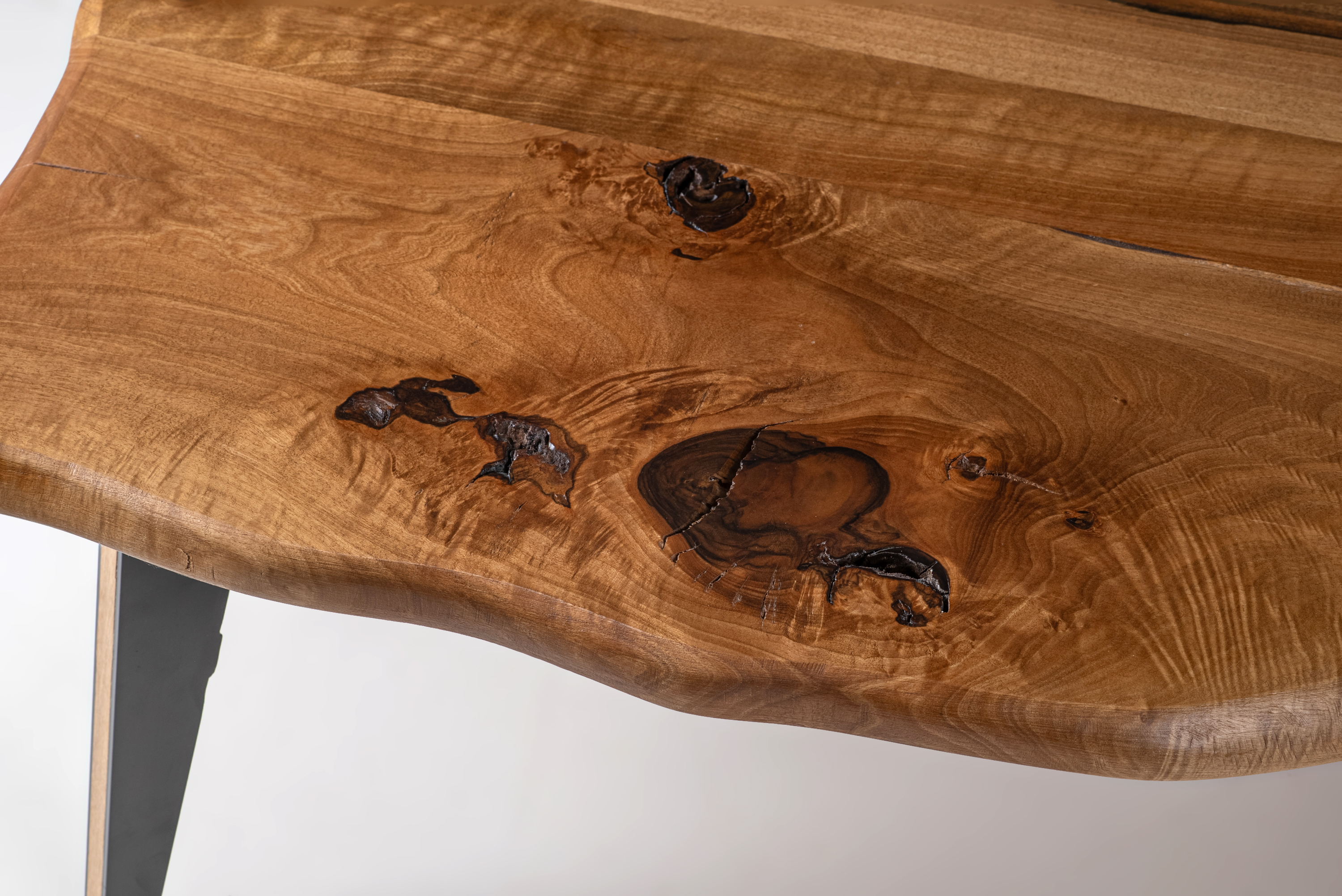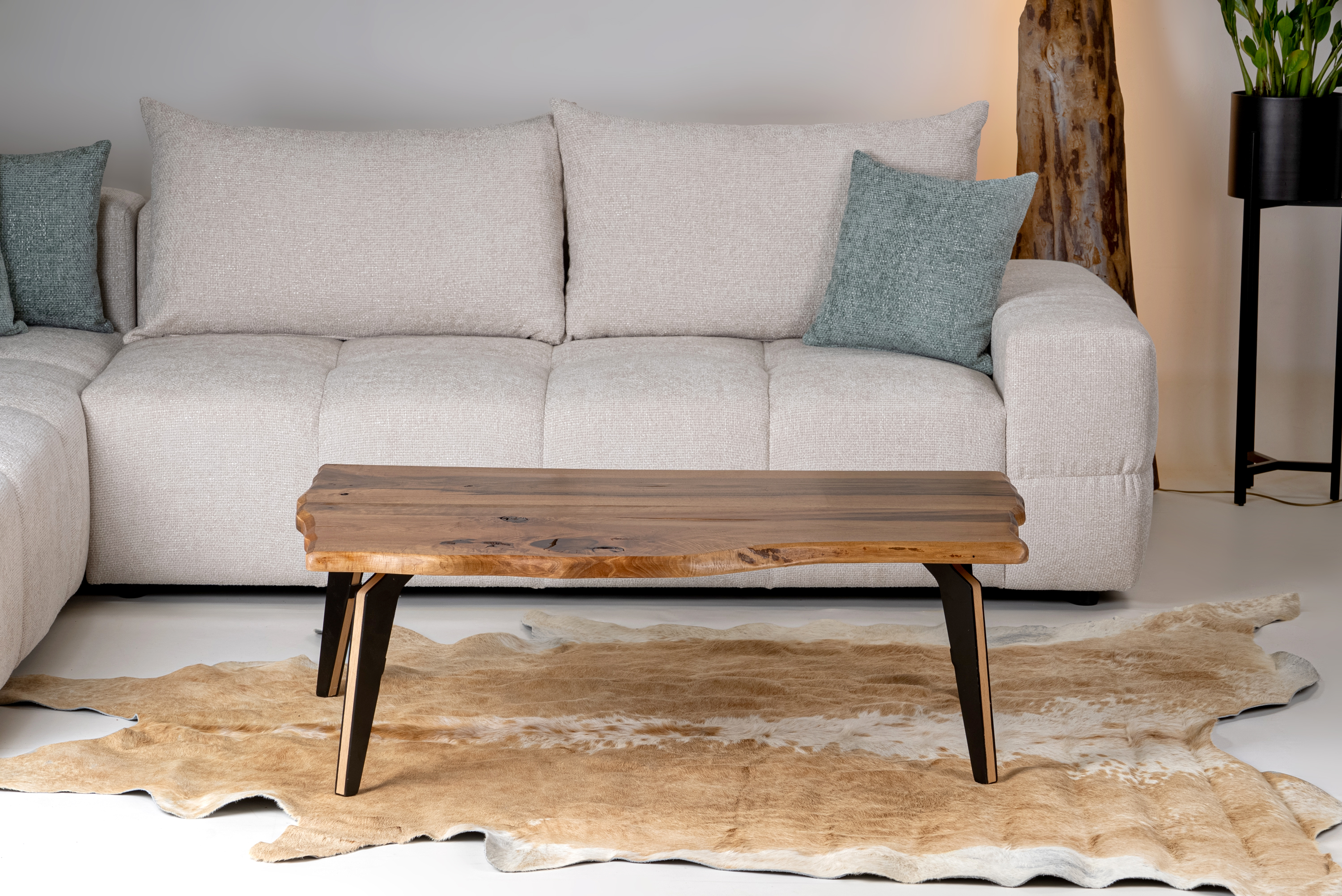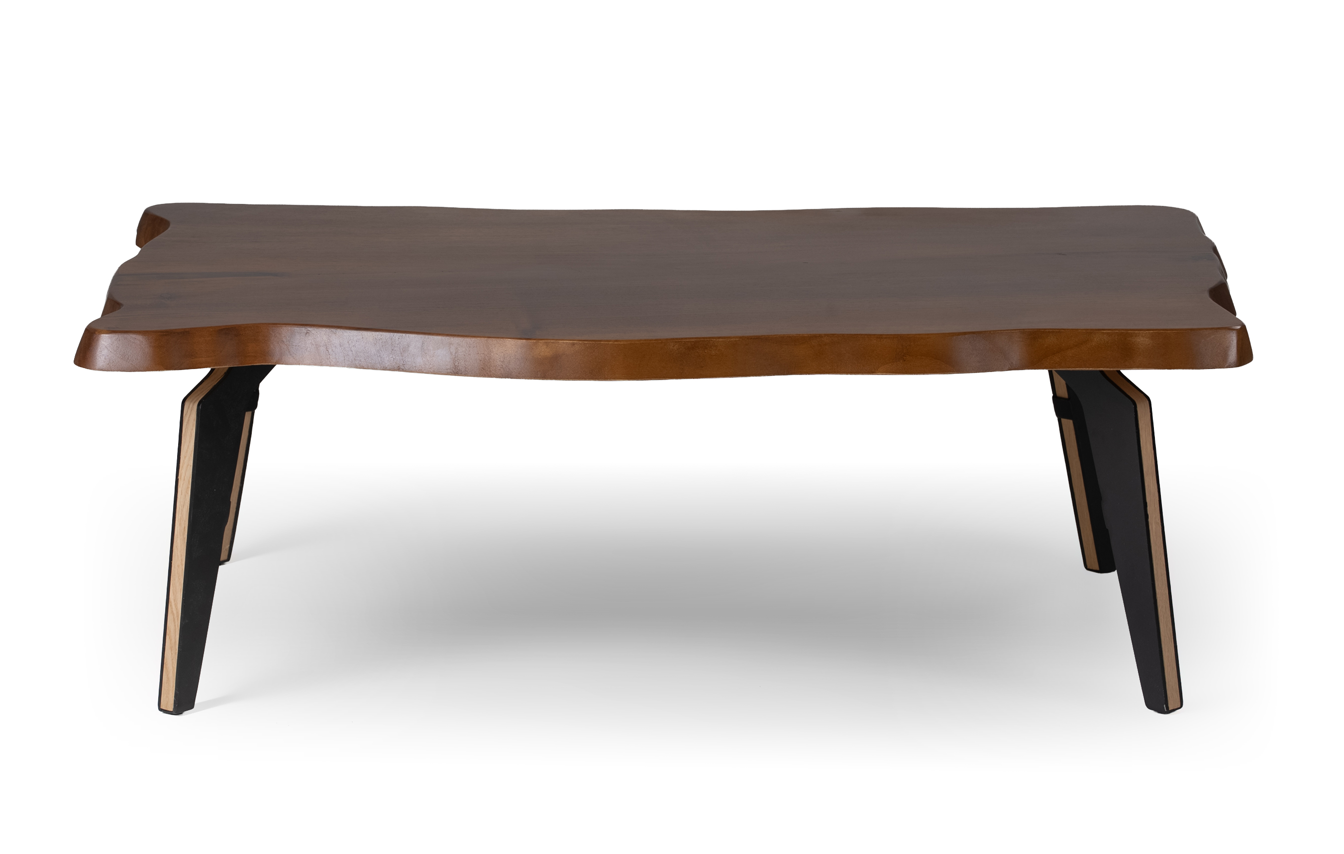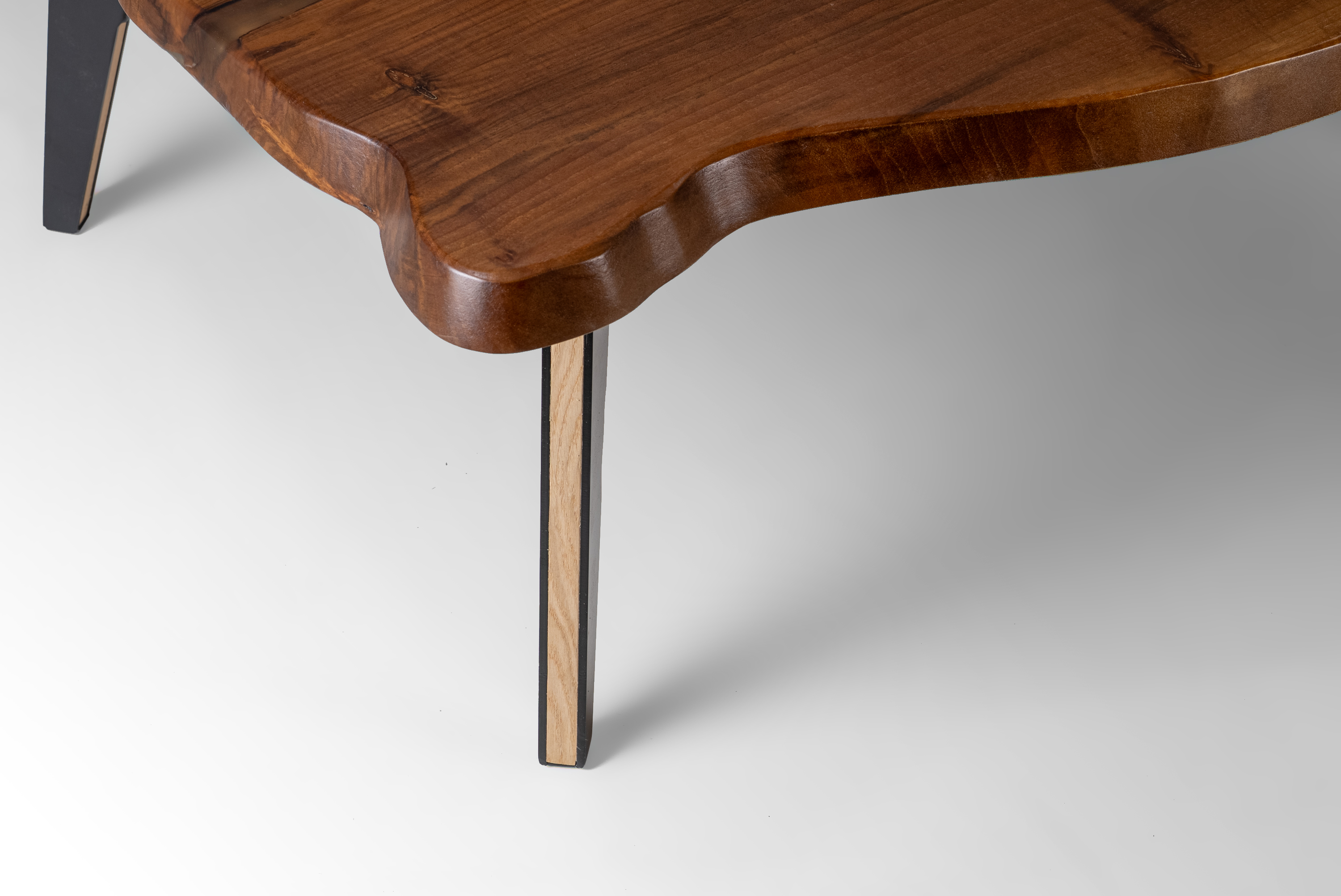 The Masif walnut 01 coffee table is a unique piece of furniture crafted from authentic solid walnut wood. Its surface preserves the natural shape of the tree slab, highlighting the wood grain, knots, and organic curves, creating a warm and distinctive aesthetic.