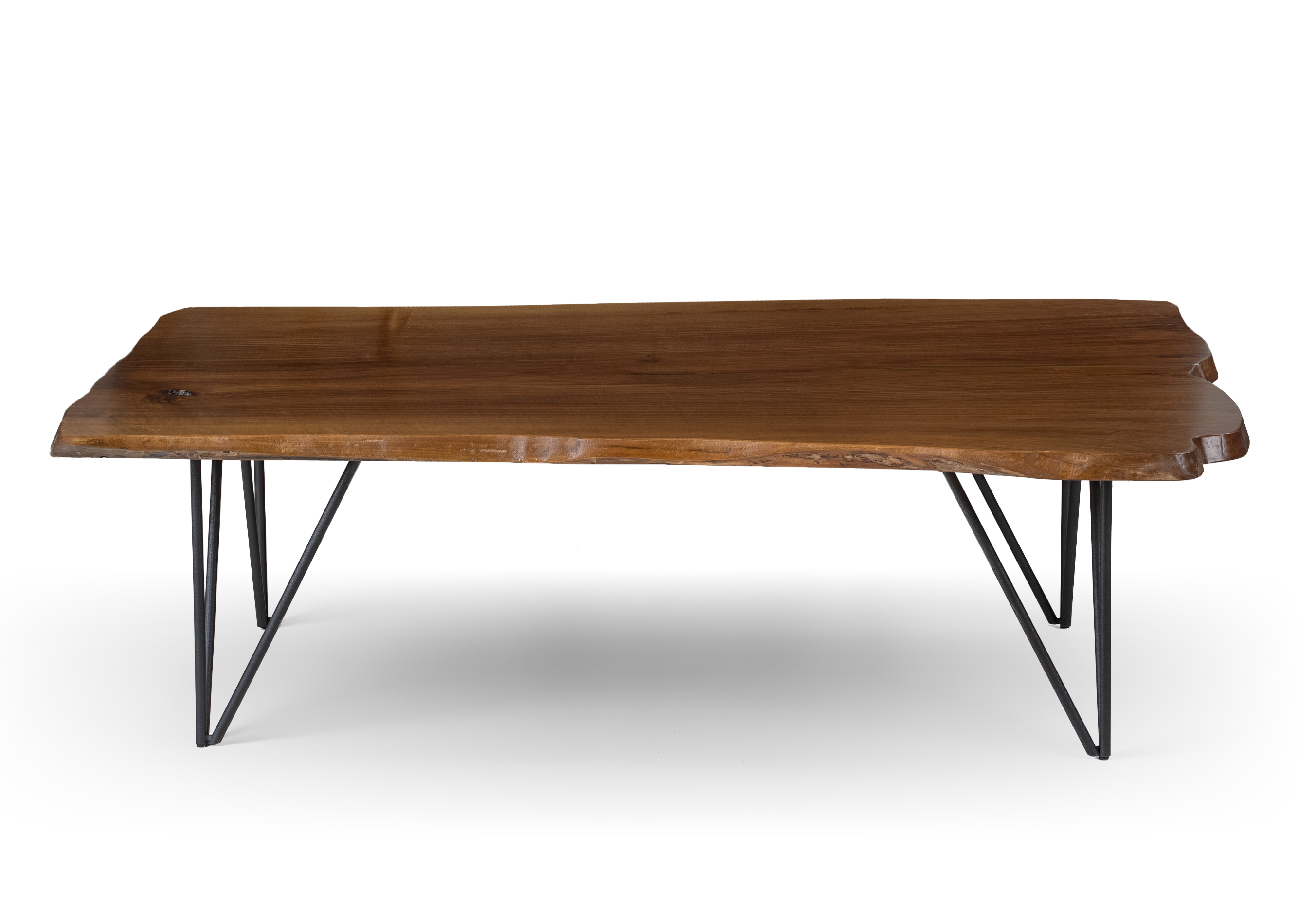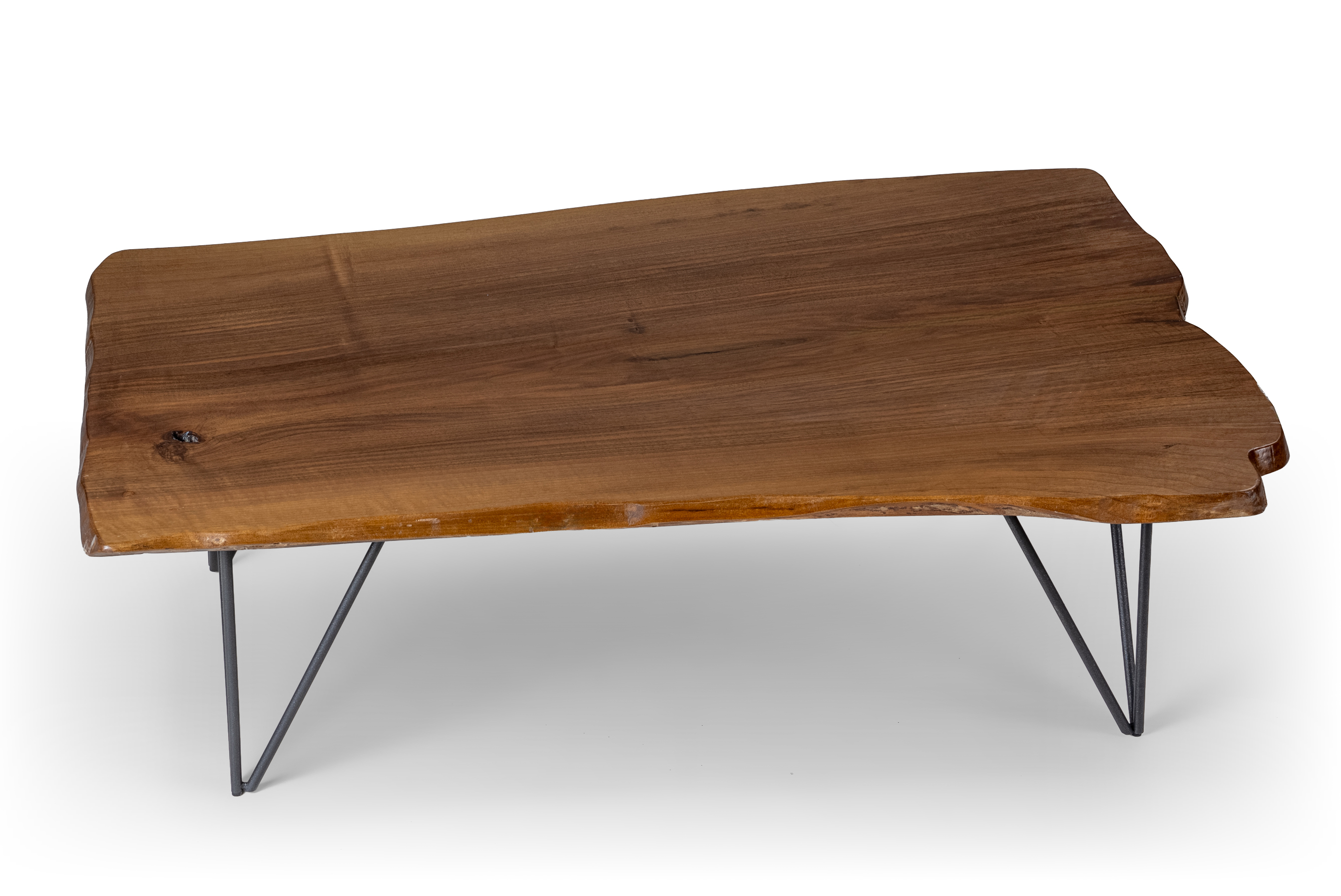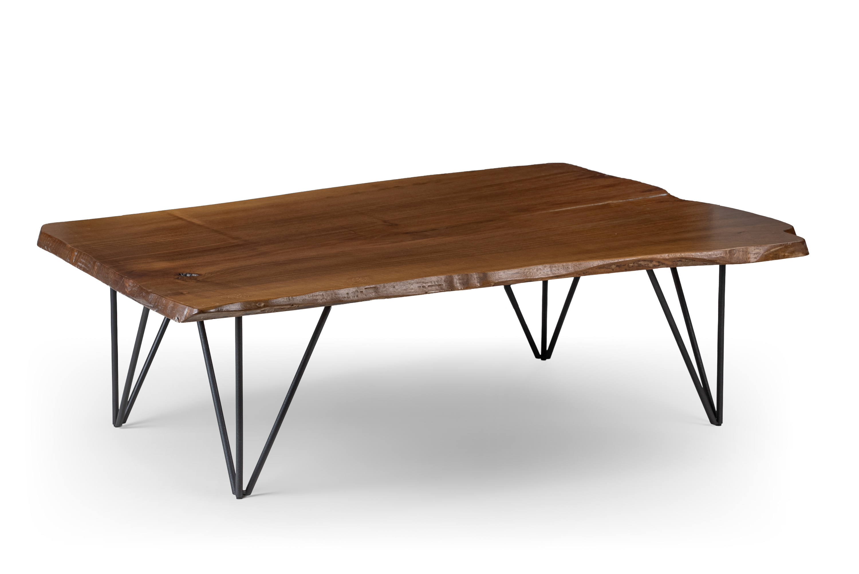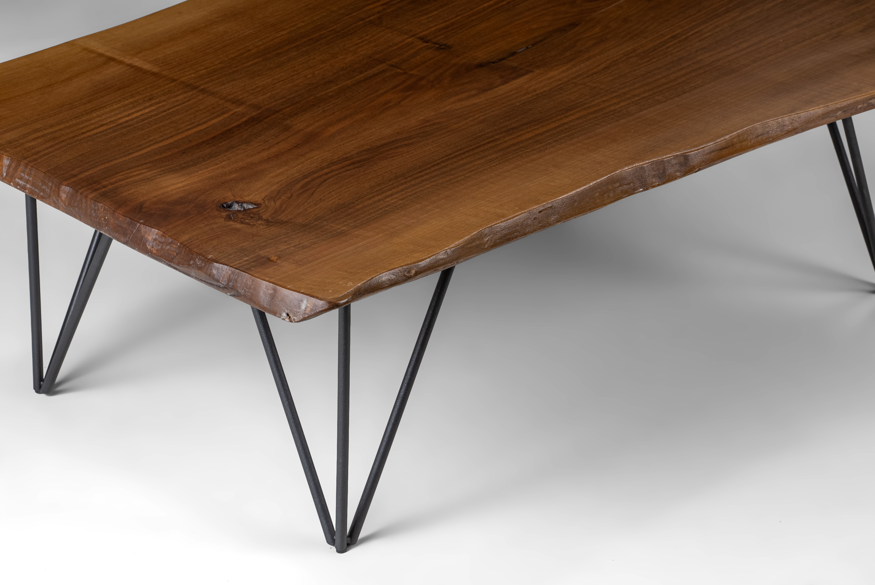 Handcrafted coffee table made from authentic solid walnut wood, designed to highlight the natural beauty of the material through organic lines and unique grain patterns. The surface preserves the natural curves of the trunk, offering a genuine live edge aesthetic. The base features industrial-style metal legs in black finish, providing stability and a modern character. Each piece is unique, as walnut wood carries natural knots, grains, and color variations that can never be replicated. Ideal for modern, industrial, or rustic interiors. Suitable for everyday use with long-lasting durability.