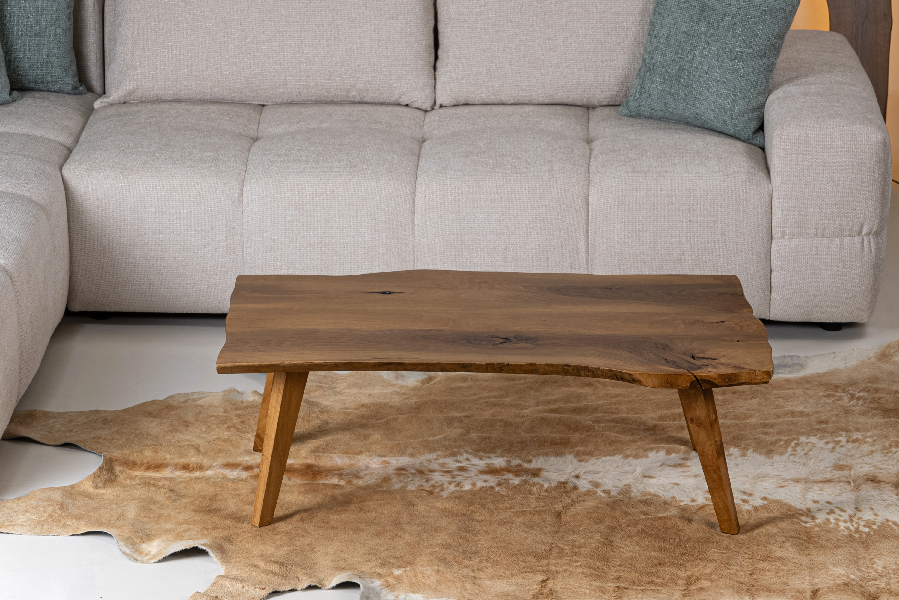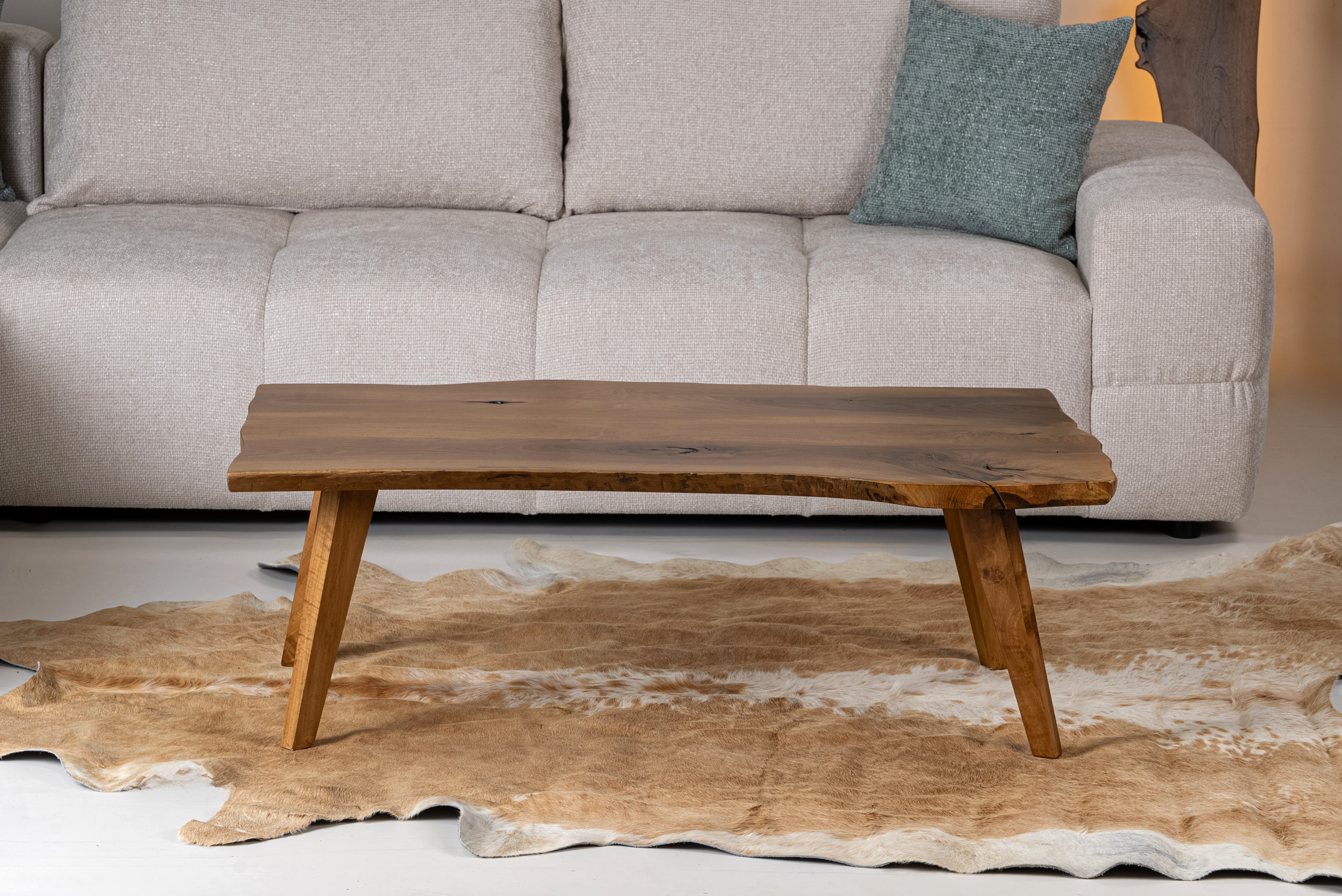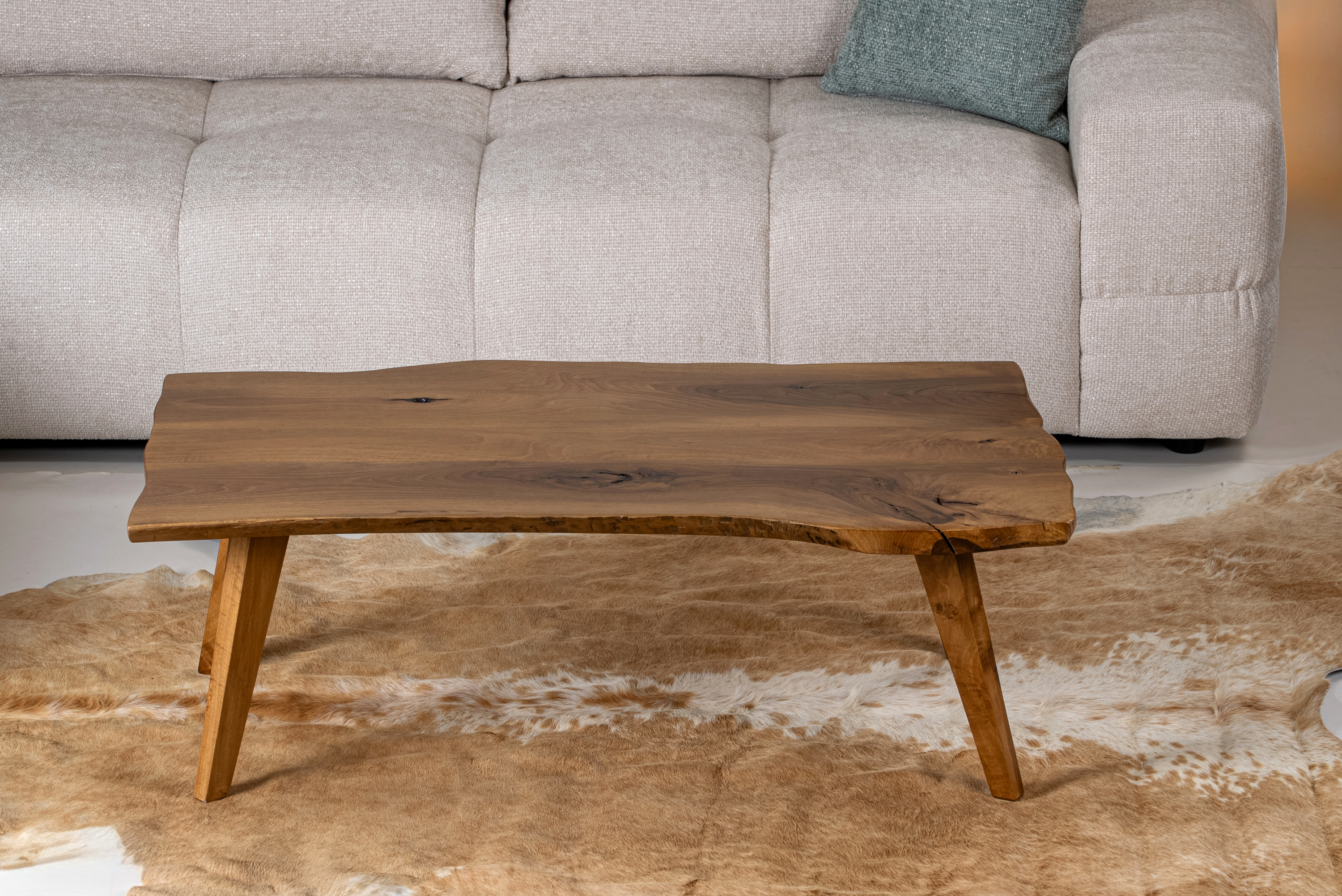 The solid wooden legs are slightly angled, providing excellent stability and a contemporary aesthetic. Its live edge design makes it ideal for minimal, boho, and modern rustic interiors, perfectly complementing fabric sofas and natural décor elements.