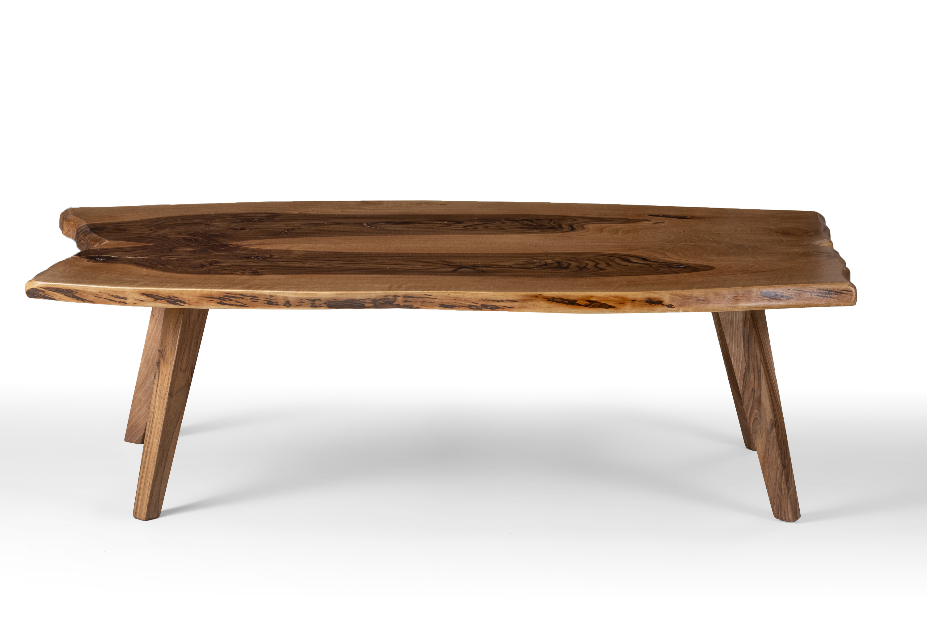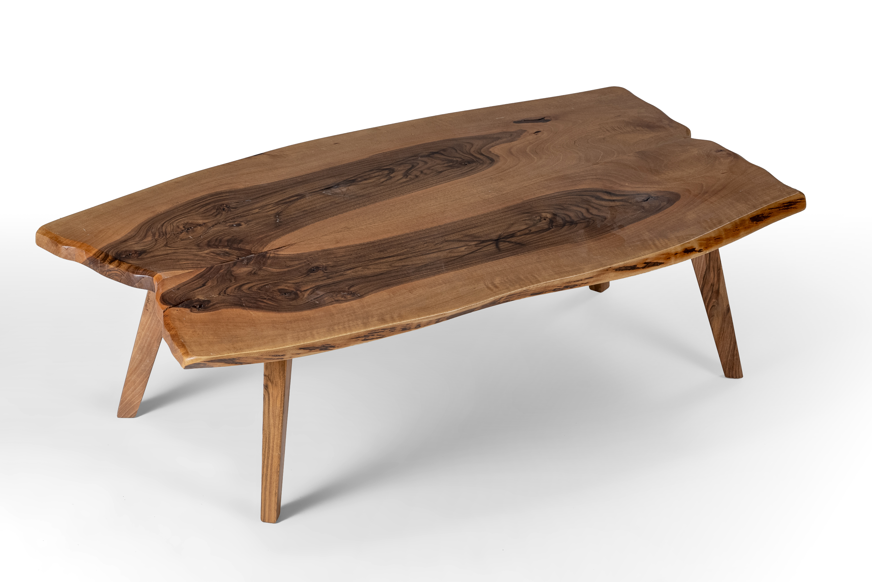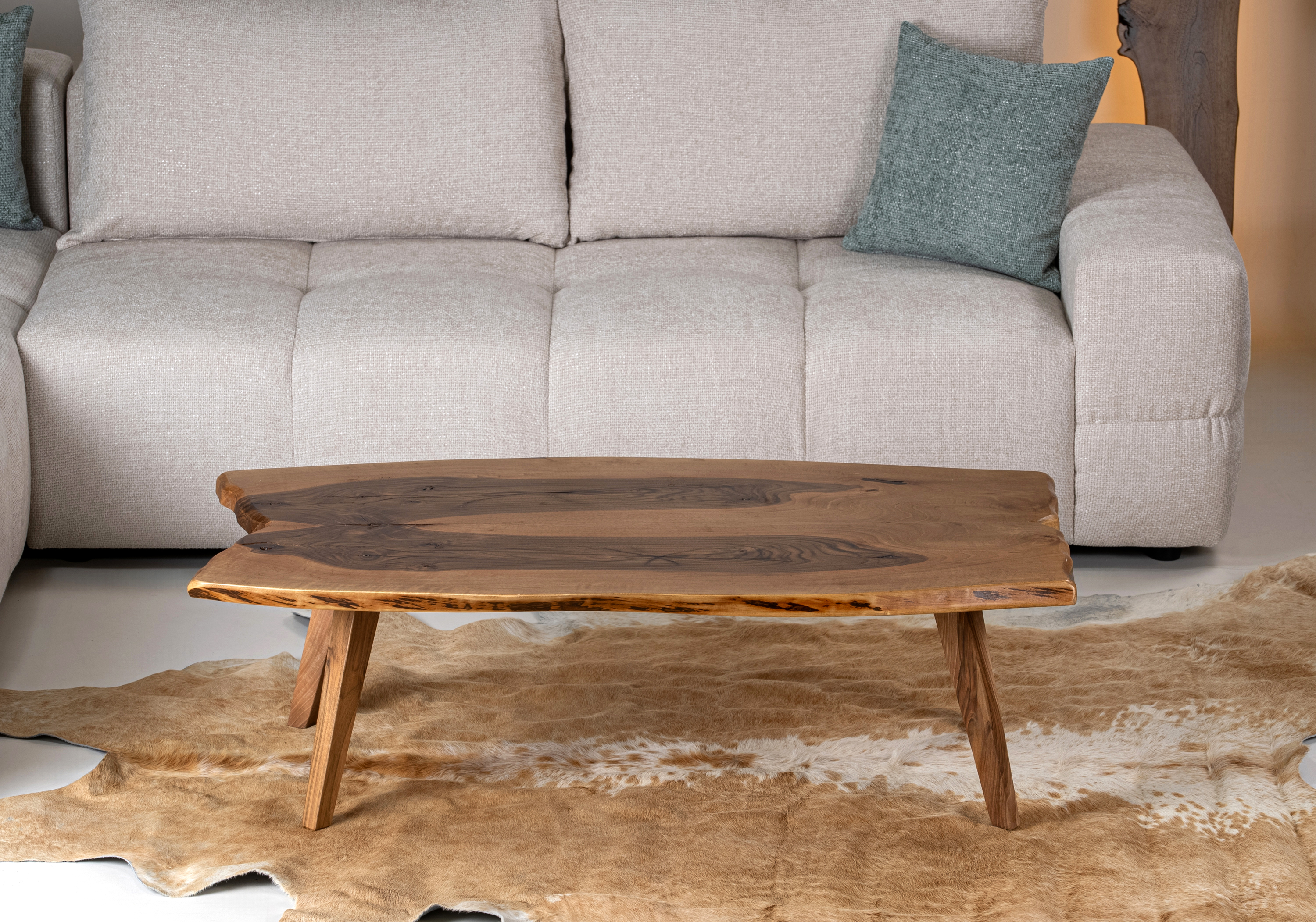 The Masif Walnut 04 coffee table is crafted from premium solid walnut wood, preserving the natural live edge and unique grain patterns of the timber. Each piece is one of a kind, as the organic form of the wood is maintained, creating an authentic and artistic result.