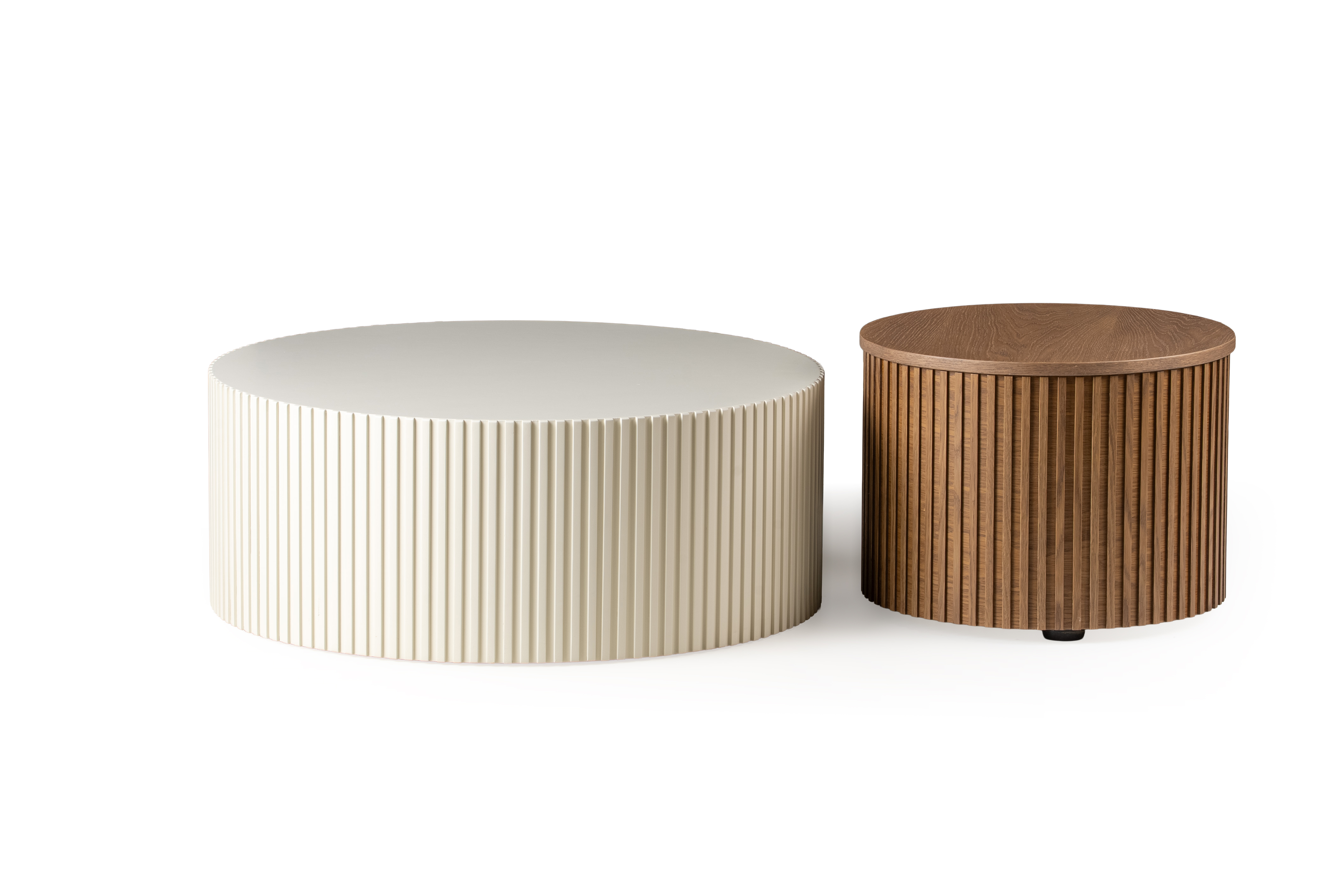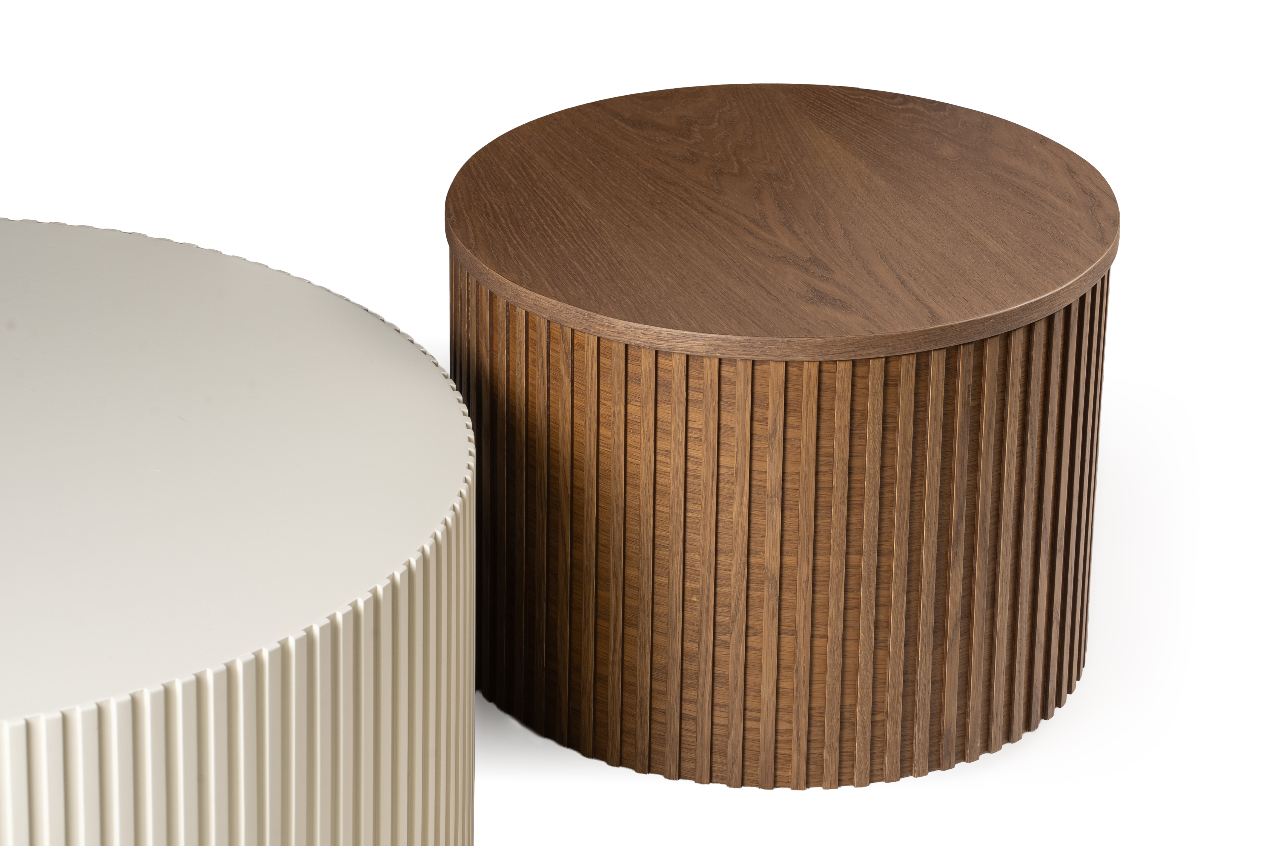 The high-quality wooden top highlights the natural grain and texture of the material, while the distinctive fluted base creates an elegant play of light and shadow. The minimal cylindrical form gives a contemporary character that fits beautifully in modern, scandi and contemporary interiors.