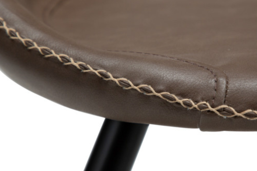 Its distinctive curved backrest embraces the body, offering both comfort and support. Upholstered in cognac faux leather with decorative stitching, it adds warmth and sophistication to any dining space.