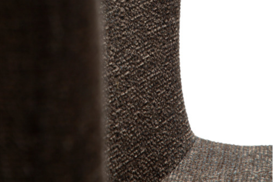 The textured bouclé upholstery in a deep brown tone adds warmth and depth, creating a sophisticated and inviting atmosphere.