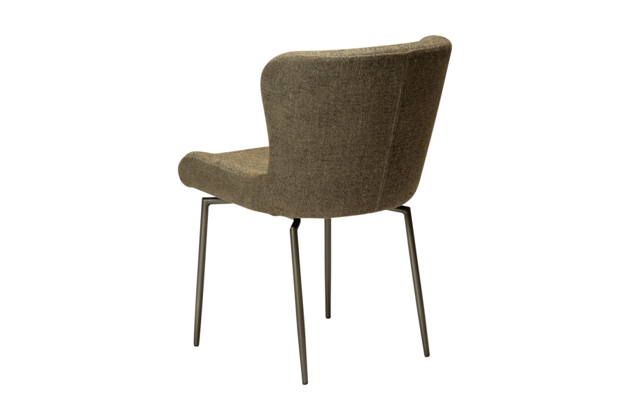 The GLAM swivel dining chair in dark olive bouclé fabric with antique pewter metal legs delivers a bold yet refined aesthetic, blending earthy tones with contemporary elegance.