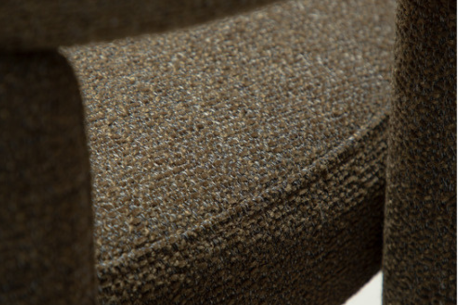 Its sculptural form features soft curves and harmonious lines that naturally support the body, offering both comfort and ergonomic seating. The chair is fully upholstered in high-quality fabric from top to bottom, enhancing its refined appearance and modern minimalist character.
