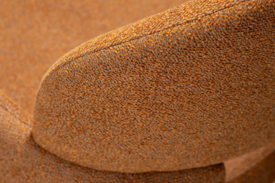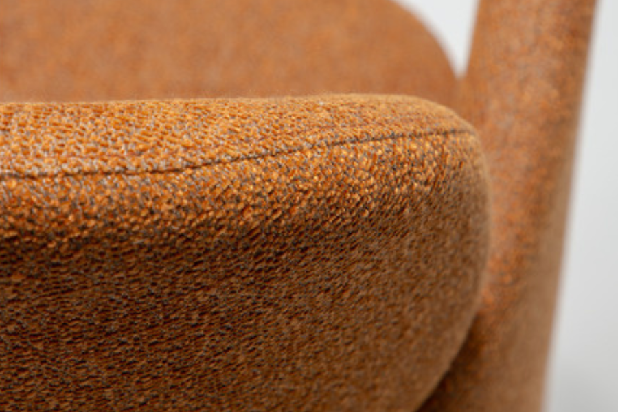 Its sculptural shape features soft curves and ergonomic lines that comfortably support the body. The chair is fully upholstered in high-quality fabric, covering the entire structure from top to bottom and enhancing its refined minimalist appearance.