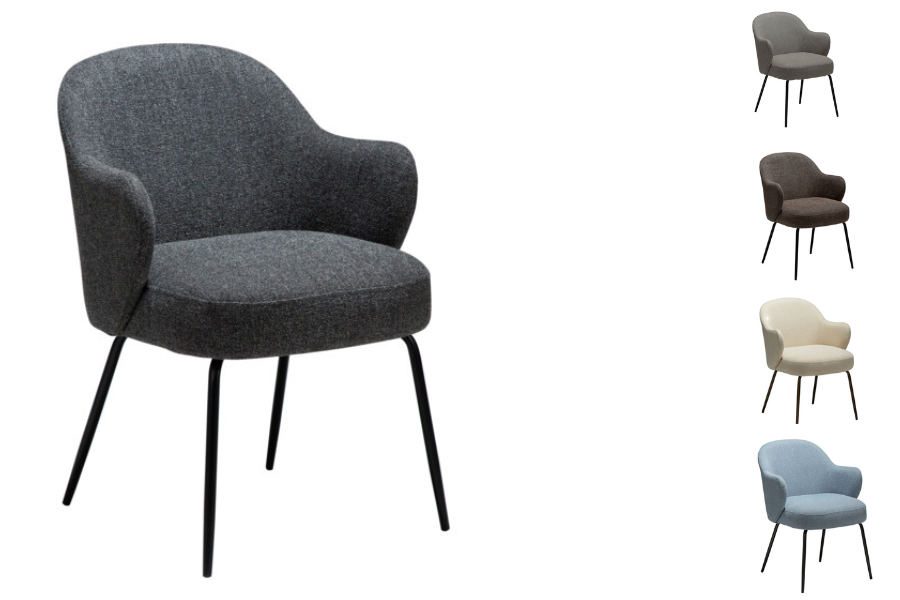 The chair is upholstered in durable fabric in a Pebble Grey shade, creating a refined and timeless look that easily complements modern, minimalist, or Scandinavian interiors. The generously padded seat and ergonomic backrest enhance comfort, making the chair suitable for extended seating.
