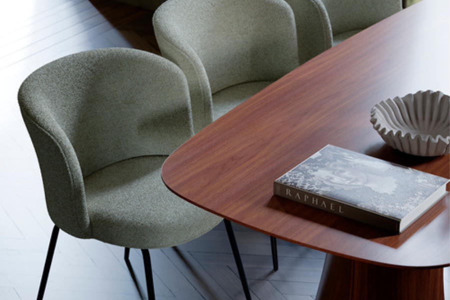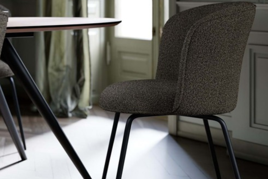 Upholstered in bouclé fabric in the Major Brown shade, the chair introduces warmth and refined texture to the interior. The distinctive fabric surface adds depth and character to the design while complementing both modern and classic dining environments.
