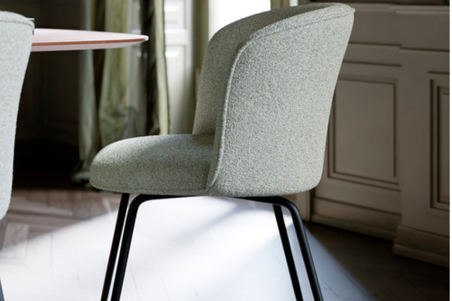 Upholstered in bouclé fabric in the Pebble Earth shade, the chair adds warmth and natural elegance to the dining space. The textured fabric enhances the visual depth of the design and pairs effortlessly with both modern and timeless interiors.