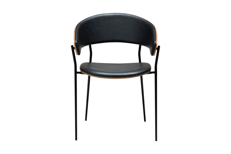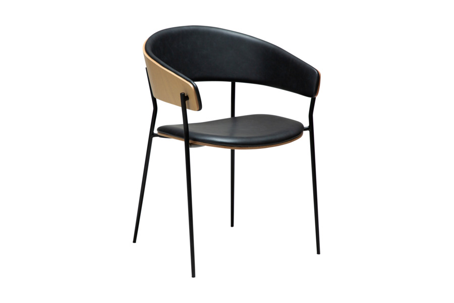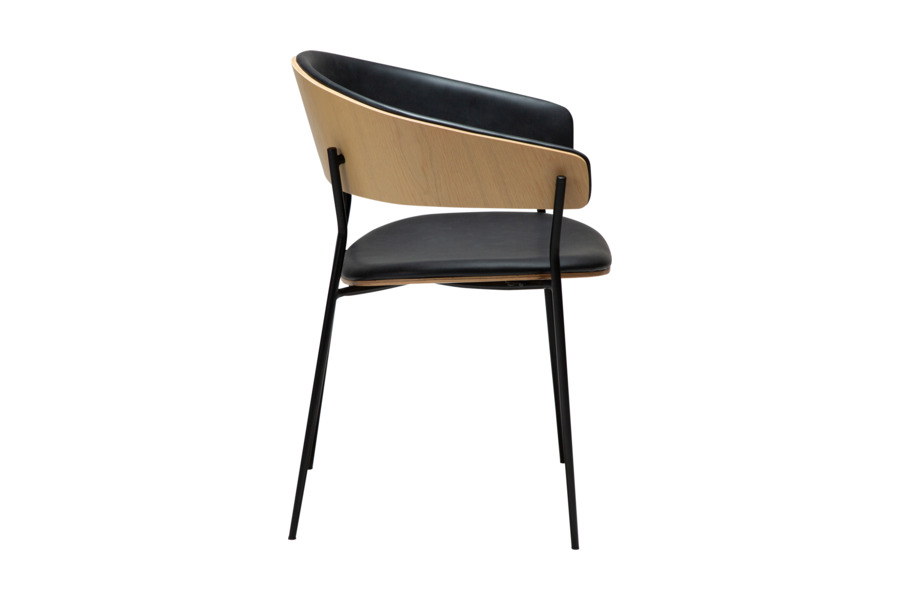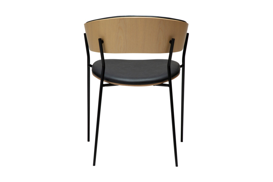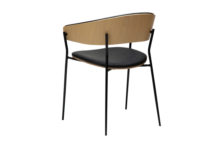 The wrap-around backrest extends into subtle armrests, providing ergonomic support and comfort. The padded seat enhances usability, making it ideal for everyday dining or professional spaces. Slim, slightly conical metal legs ensure stability while maintaining a sleek and lightweight appearance.