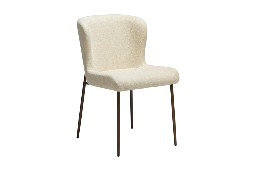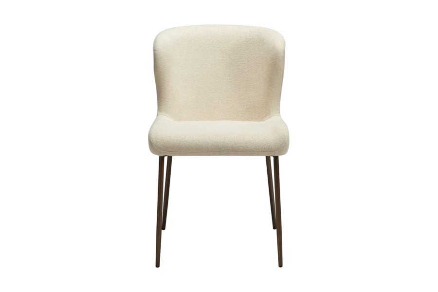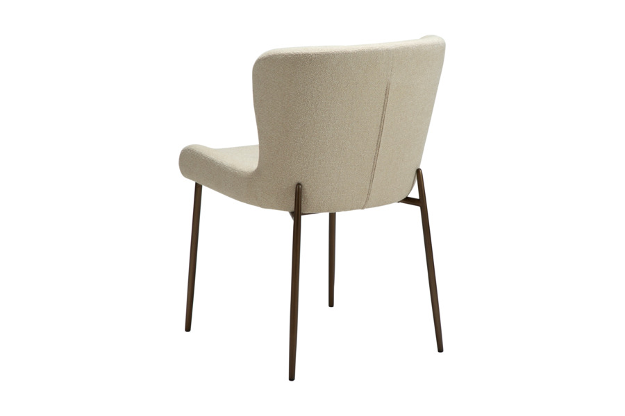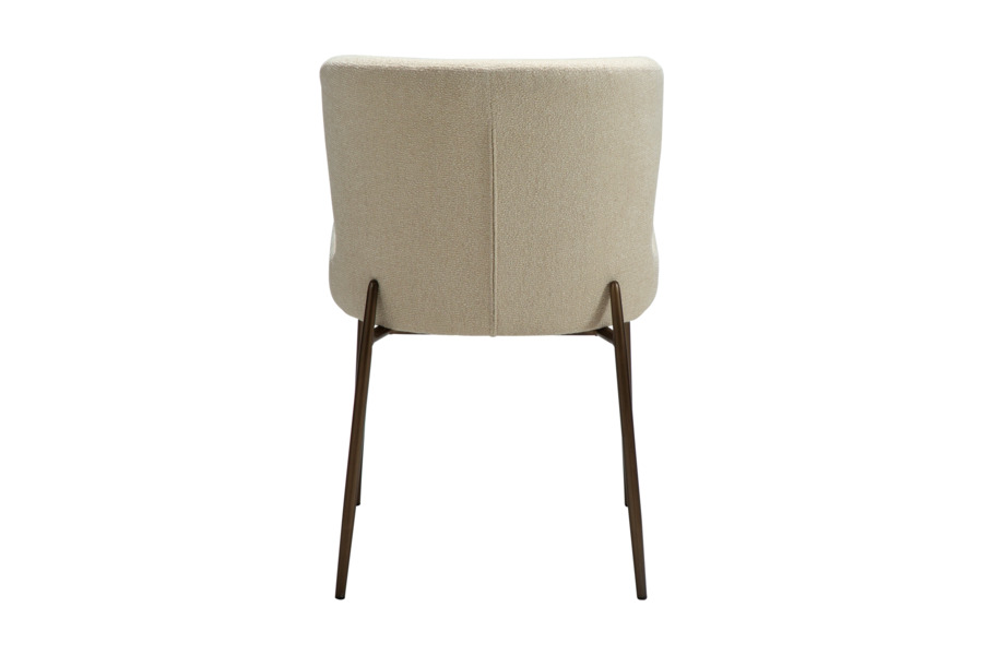 The GLAM dining chair in frosted almond bouclé fabric with antique metal legs offers a refined and elegant look, perfect for modern interiors.