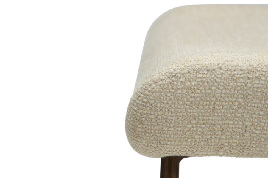 The bouclé upholstery provides a rich texture and soft feel, while the frosted almond tone creates a warm and subtle neutral palette that enhances the space without strong contrasts.