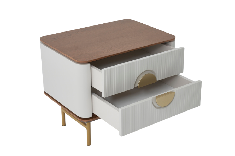 The Viola nightstand combines elegance and functionality, making it an ideal addition to modern bedrooms. Its distinctive design with rounded edges, textured details and metallic accents creates a refined aesthetic.