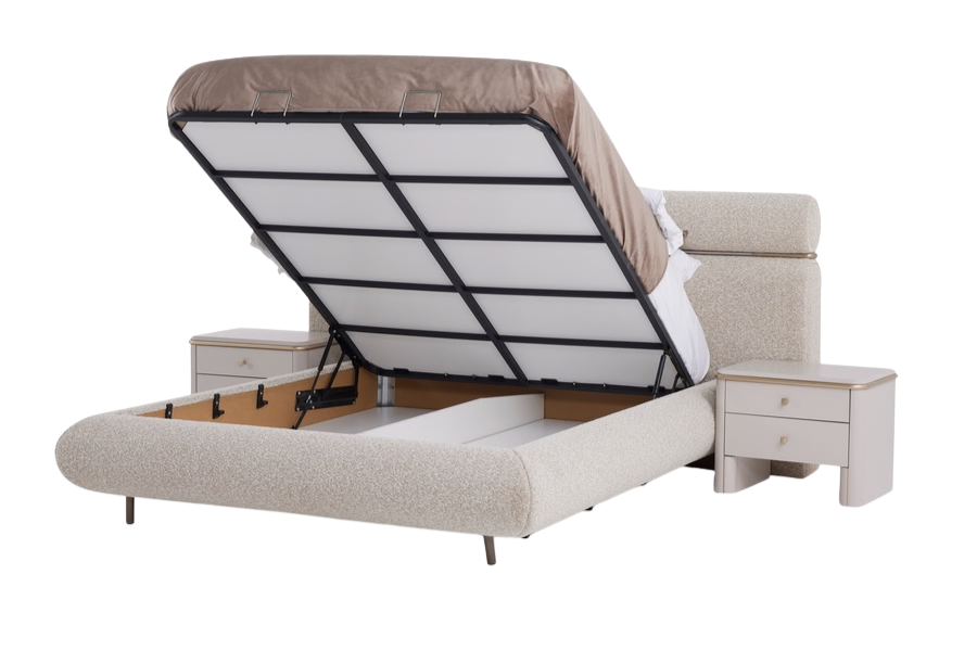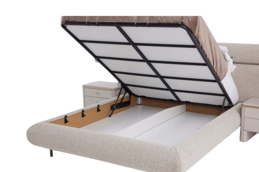 The bed features a spacious storage compartment under the mattress that opens easily with a gas-lift mechanism, providing a practical storage solution for bedding, blankets, and other household items.