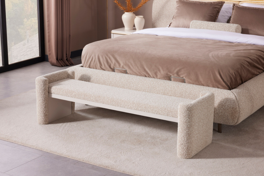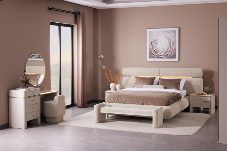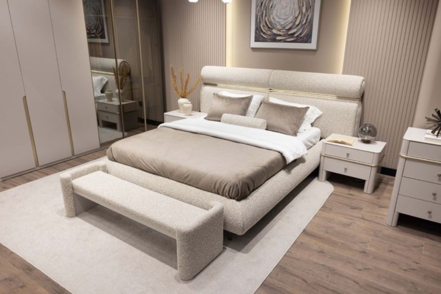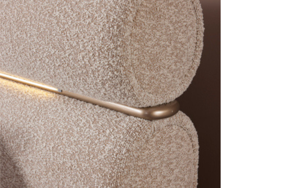 Its distinctive headboard design with soft curved lines and integrated lighting creates a warm and relaxing atmosphere in the bedroom. The upholstered fabric finish offers a luxurious feel and enhanced comfort, while the carefully crafted details highlight the bed’s modern character.