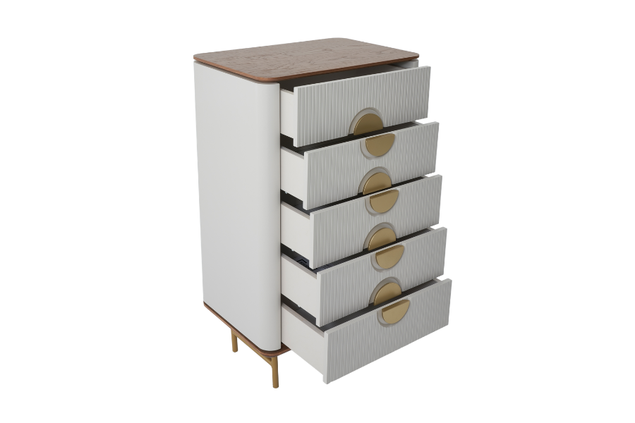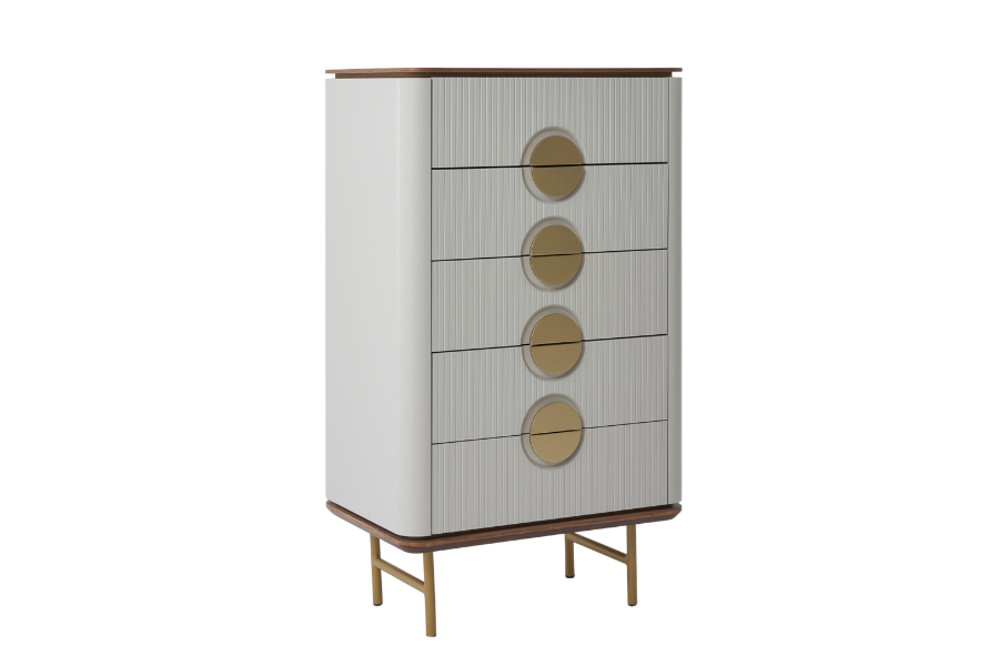 The Viola tallboy dresser is an elegant and practical solution for bedrooms that require additional storage space. Its distinctive design with vertical textured lines, rounded edges and metallic accents creates a refined aesthetic.