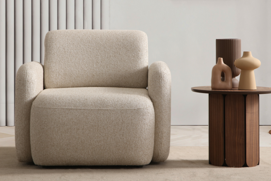 This flexibility enables you to create a piece that blends harmoniously into your space, whether your aesthetic is modern, minimal or warm and inviting. There is the option to select from different fabrics, colors and textures, allowing the armchair to adapt perfectly to your personal style and interior design here.