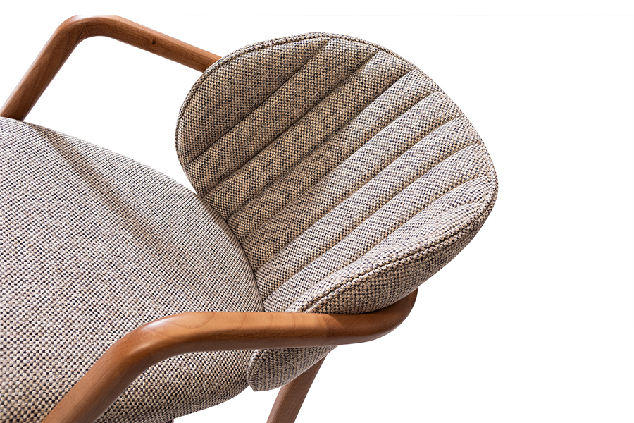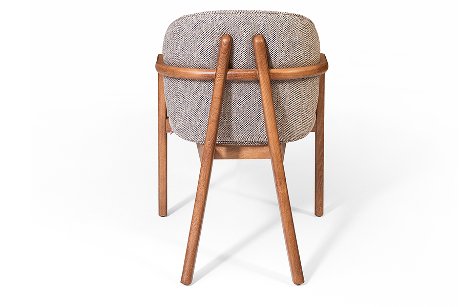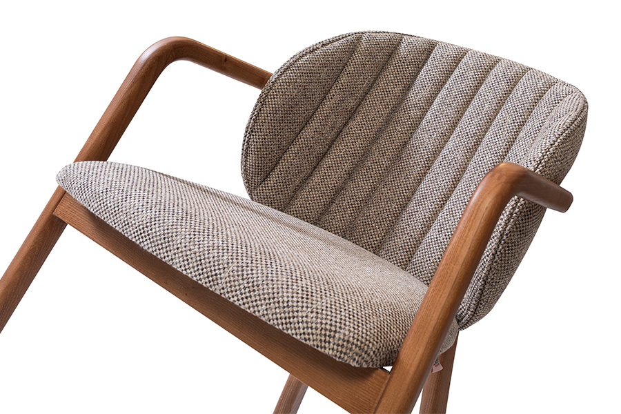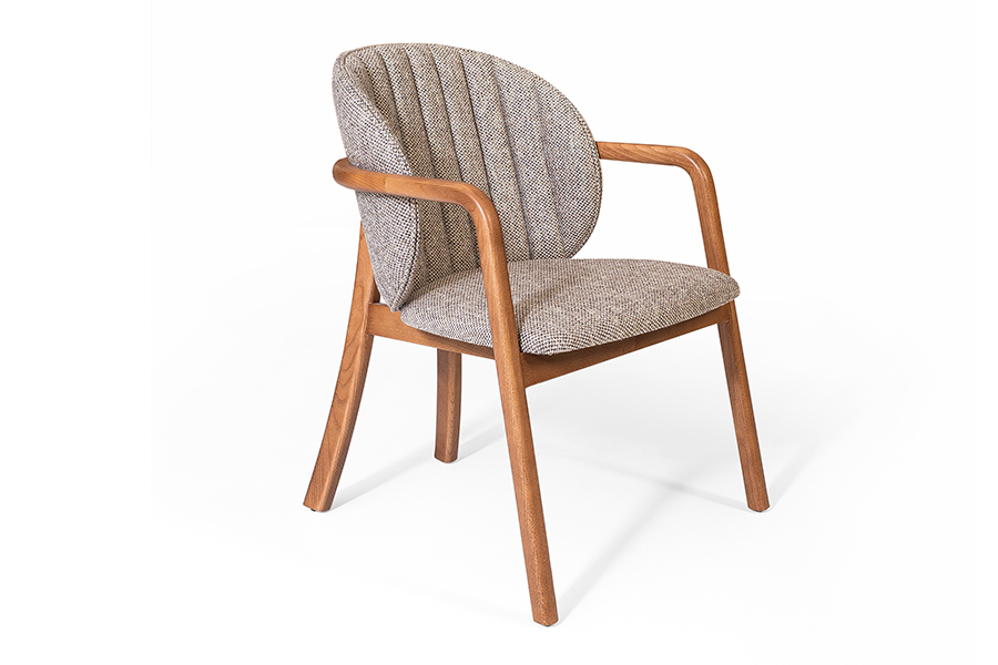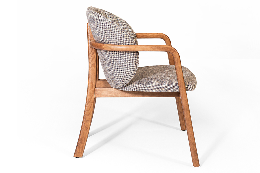 Its frame is crafted from solid wood, ensuring durability, stability and a natural aesthetic. The gently curved backrest with integrated armrests offers excellent ergonomic support and enhanced seating comfort.