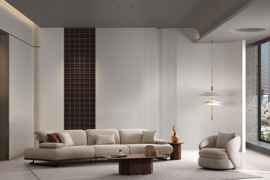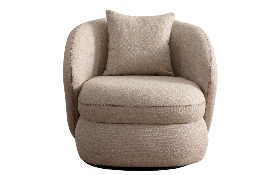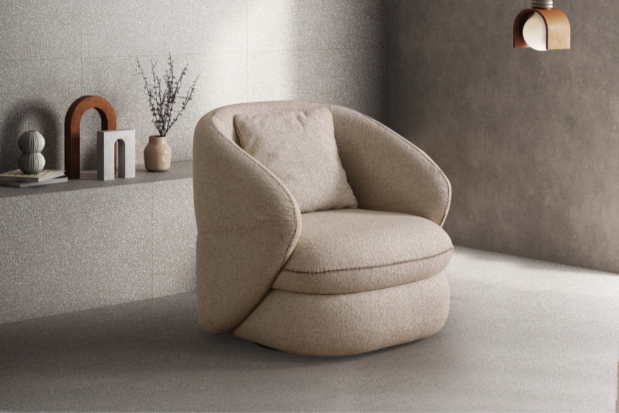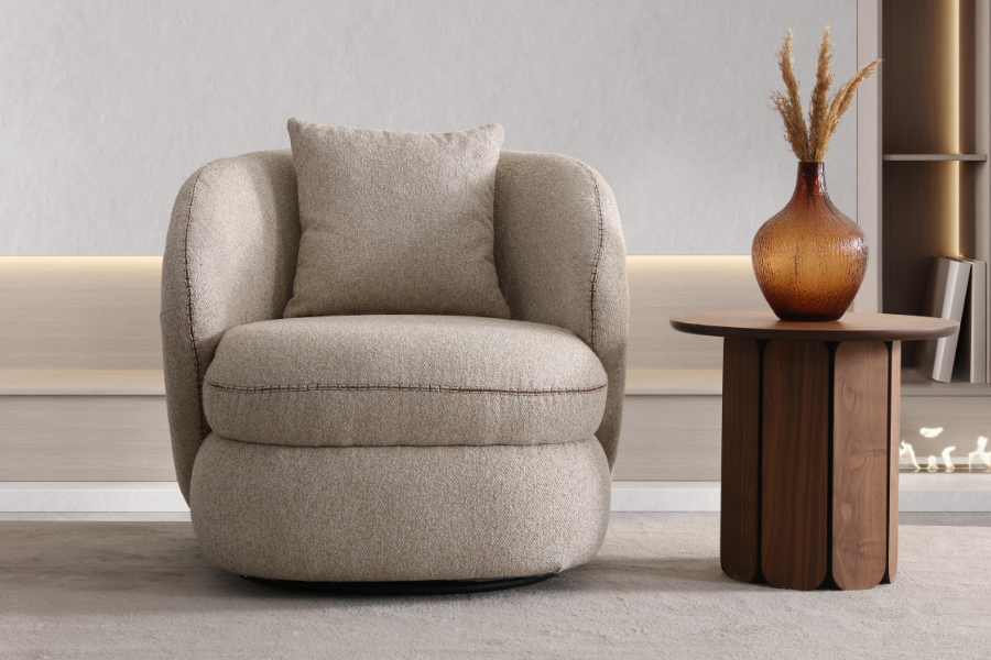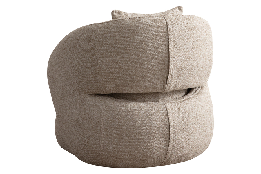 Its curved lines and distinctive volume create a unique aesthetic, while the fabric upholstery provides a warm and inviting feel.