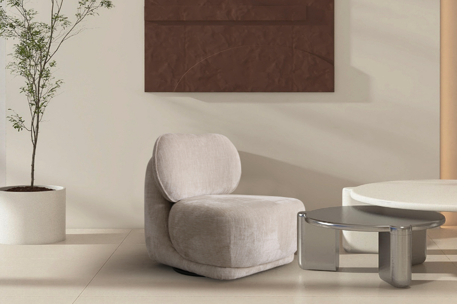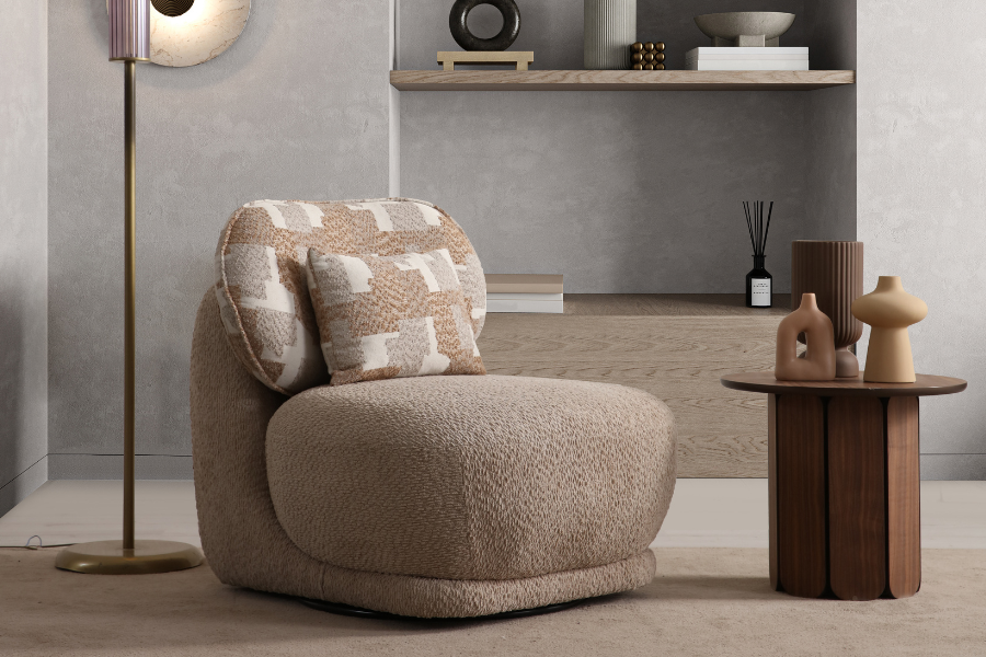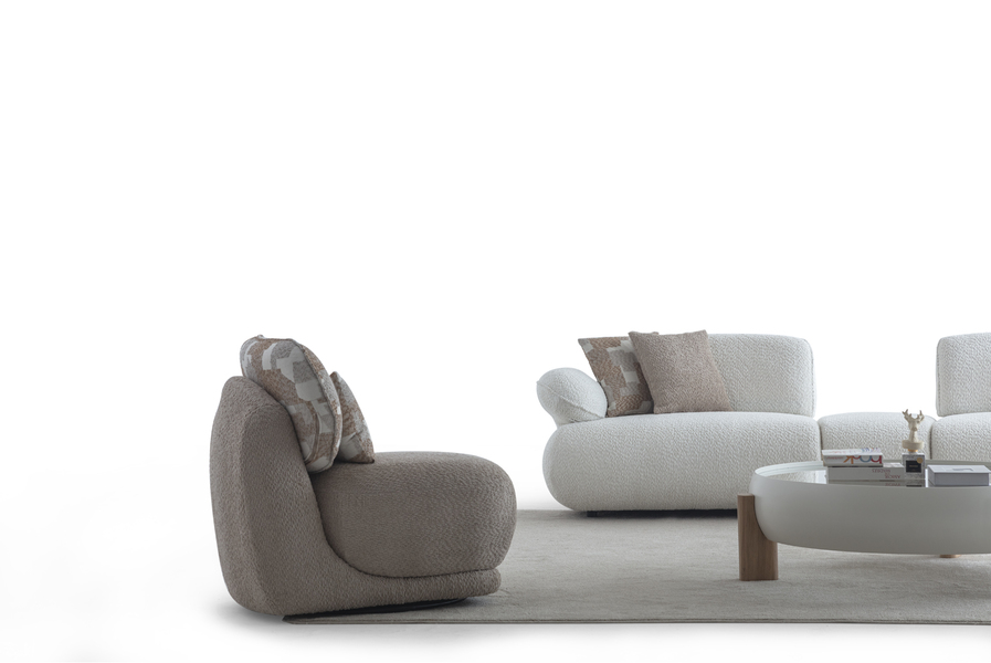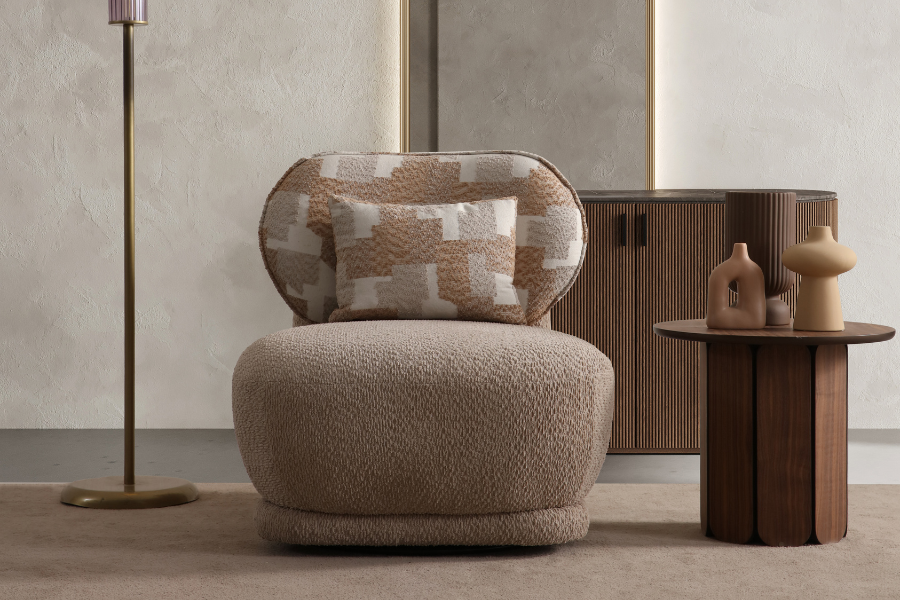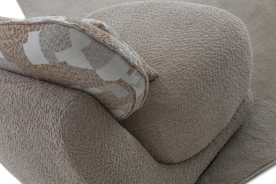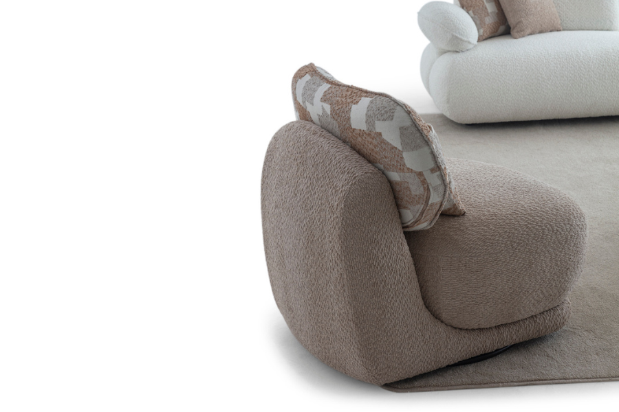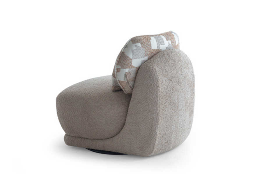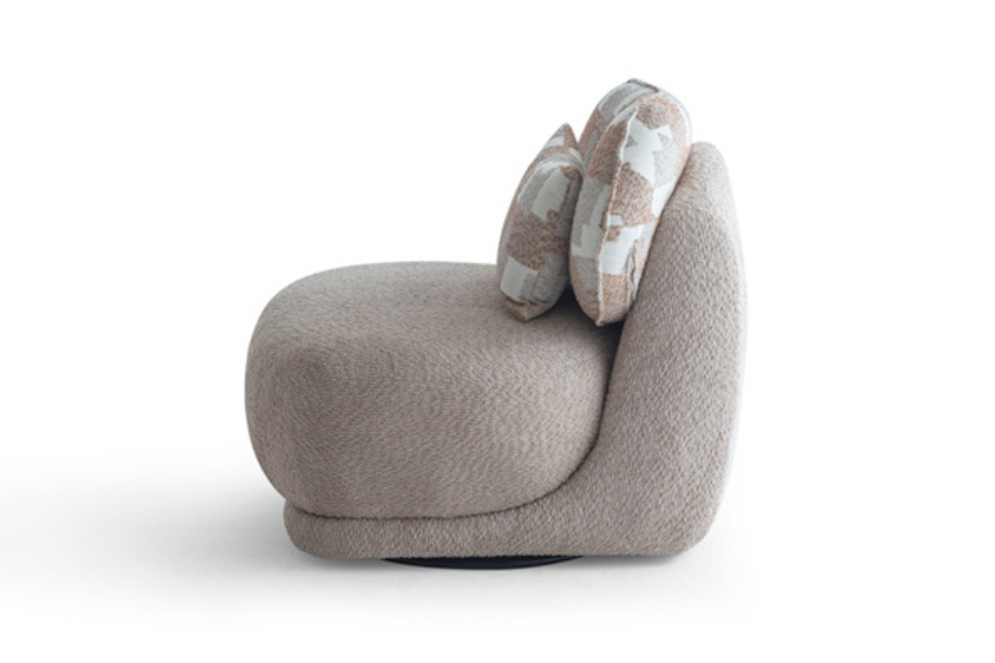 Its curved shape and fabric upholstery create a warm aesthetic, while the soft seat ensures a relaxing experience.