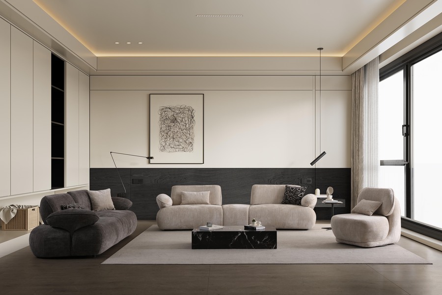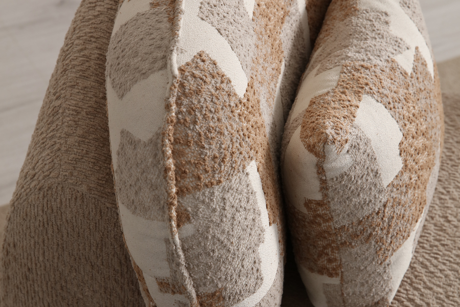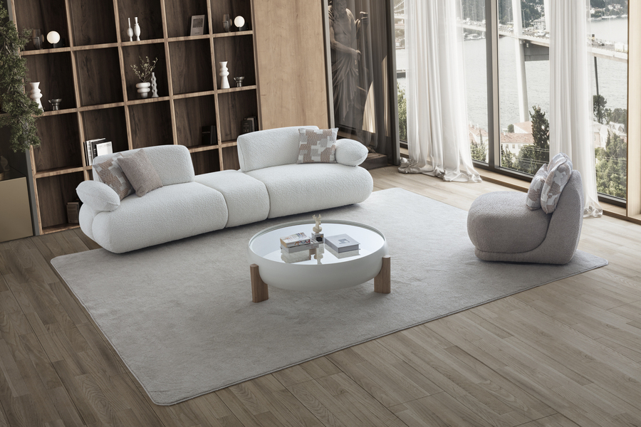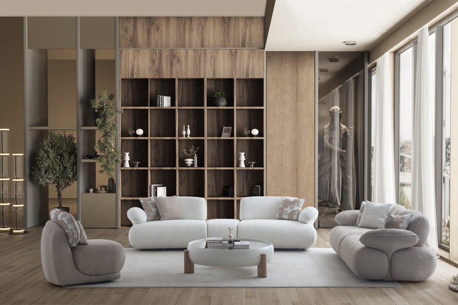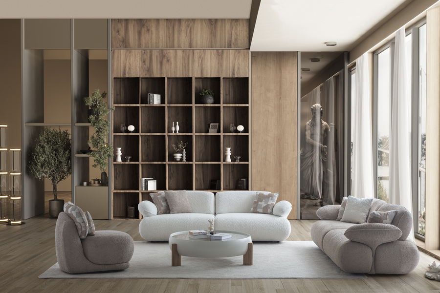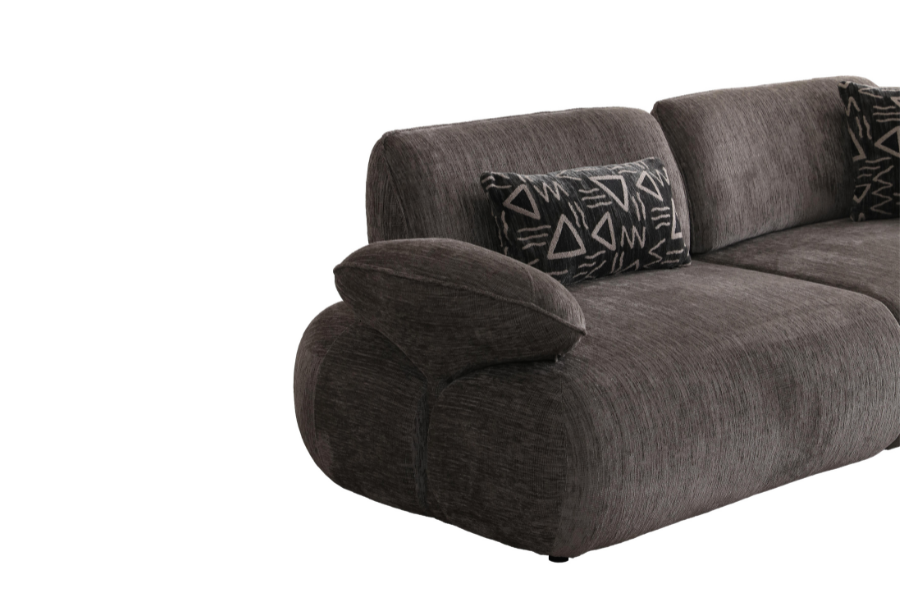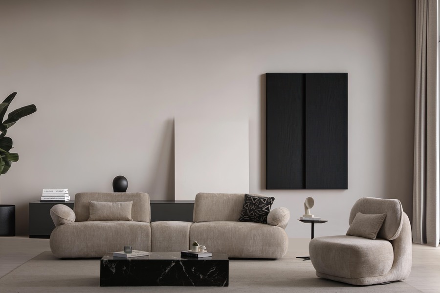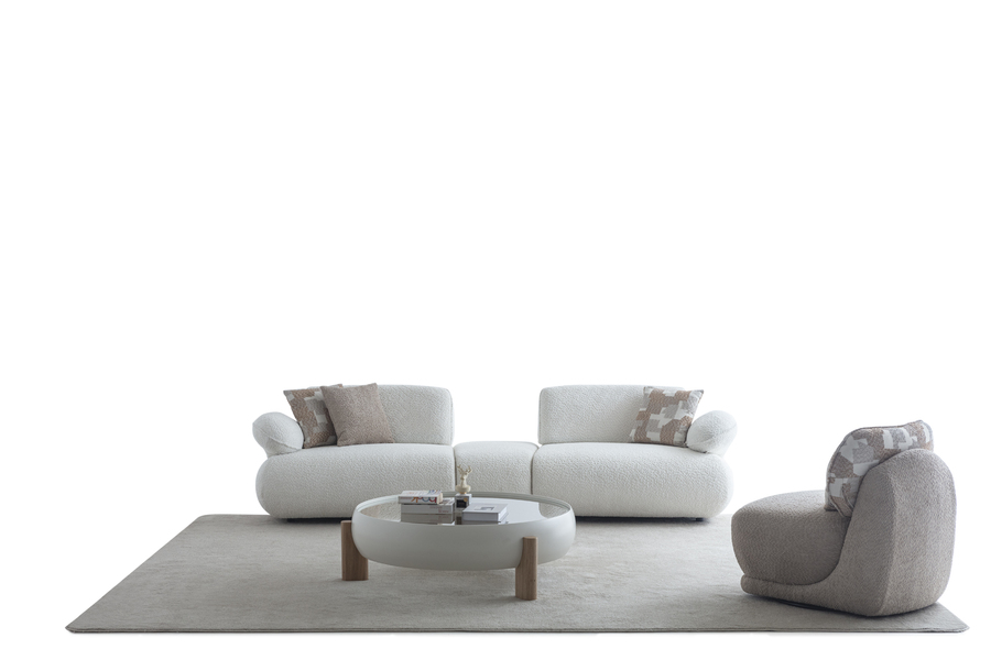 Its curved shape and fabric upholstery create a warm aesthetic, while the soft seat ensures a relaxing experience.