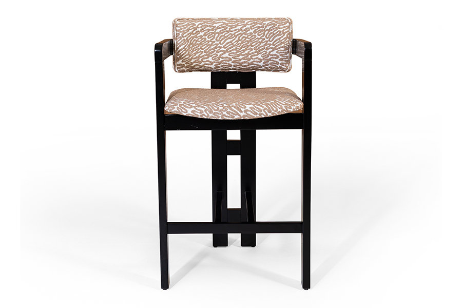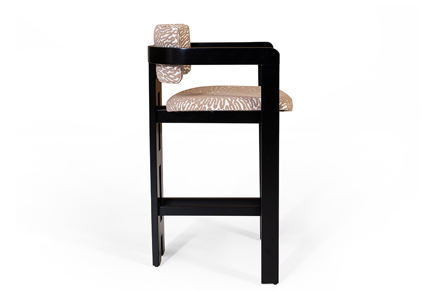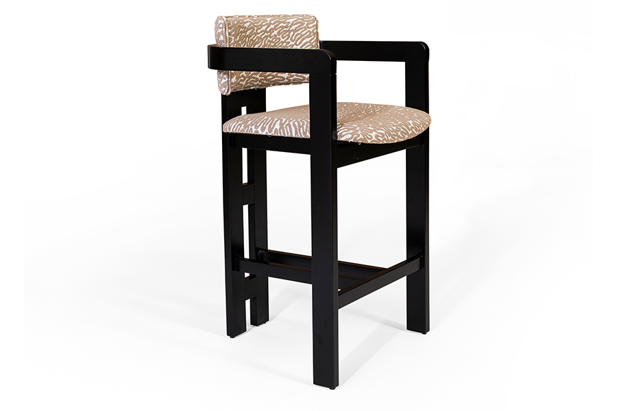 The stool is supported by a solid wooden frame in a black finish, offering durability and a contemporary aesthetic. The integrated footrest adds extra comfort and stability.