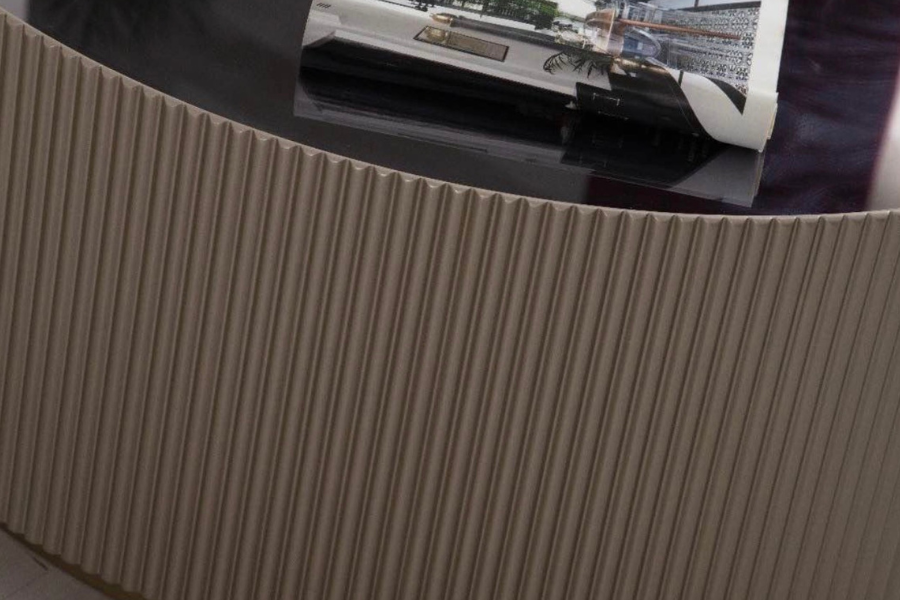 Its round design combined with a vertically ribbed base adds architectural balance and subtle elegance to the room.