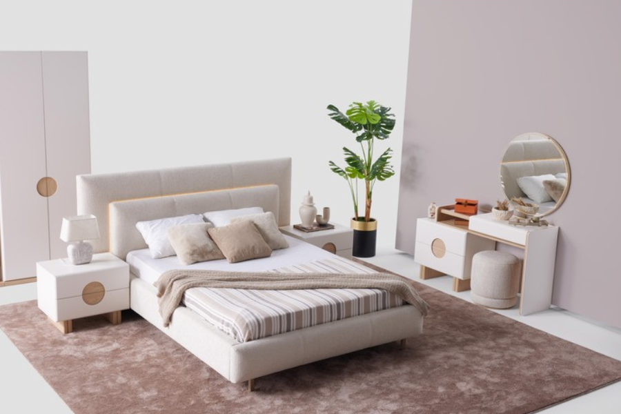 The collection features clean lines, minimal aesthetics, and refined color combinations that bring warmth and contemporary style to any bedroom interior. The upholstered bed with a padded headboard adds comfort and elegance, while the matching nightstands and dresser provide practical storage for everyday use.