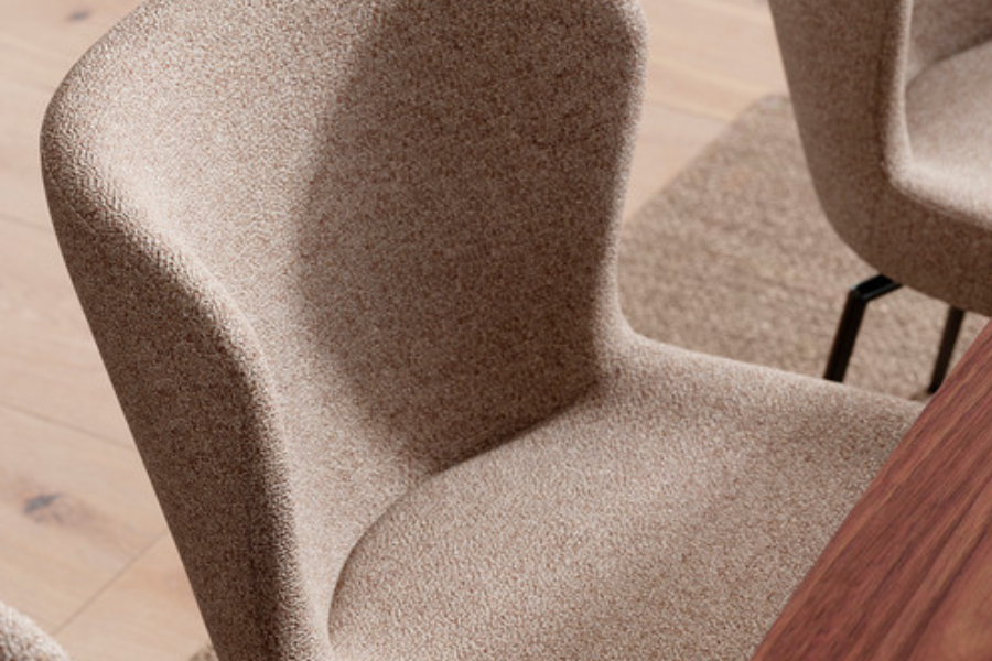 The bouclé upholstered chairs, available in neutral tones such as pebble earth, bone white and grey, create a warm and inviting atmosphere that fits effortlessly into any interior.