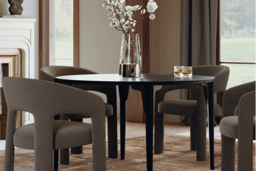 The table, featuring a black-stained ash veneer top, creates a natural yet elegant focal point, while its rounded shape enhances flow and warmth within the space. The uniquely designed legs ensure stability and highlight craftsmanship.