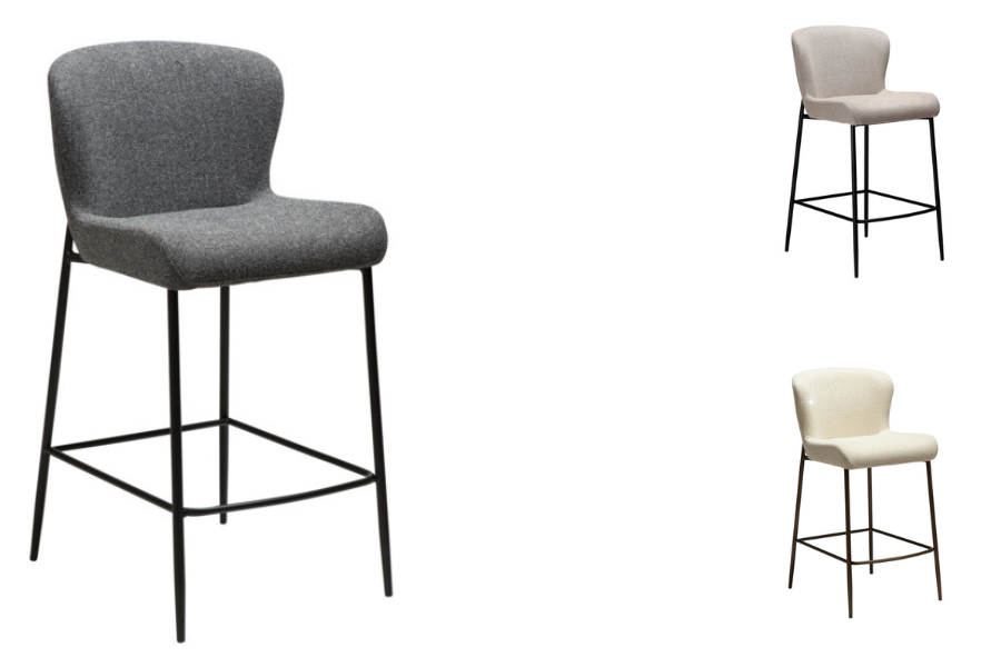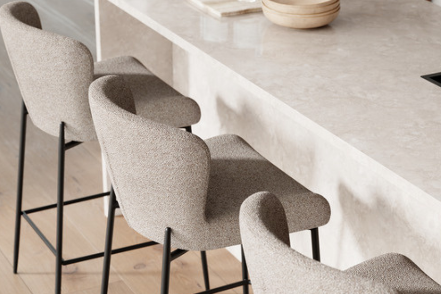 The GLAM counter stool in pebble grey bouclé fabric combines comfort and modern elegance, making it ideal for kitchen counters and islands.