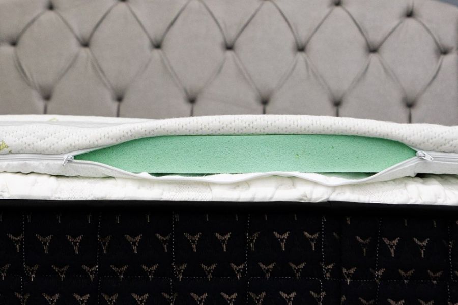 The topper is equipped with a removable and washable cover infused with aloe vera extract. Aloe vera is widely known for its natural antibacterial, hypoallergenic and moisture-regulating properties, helping create a clean and healthy sleeping environment. Its soothing and calming benefits also contribute to a feeling of relaxation and overall well-being throughout the night.