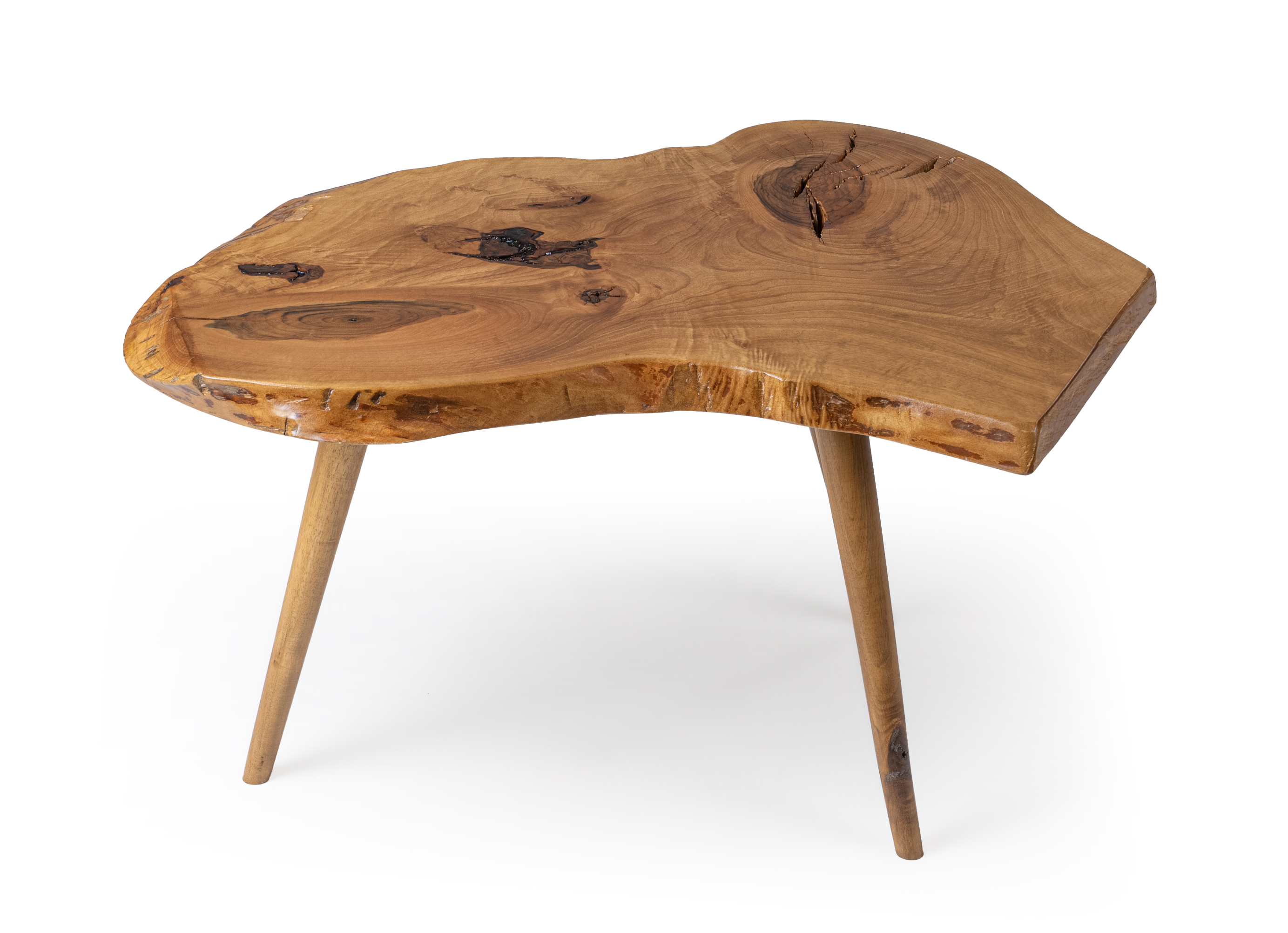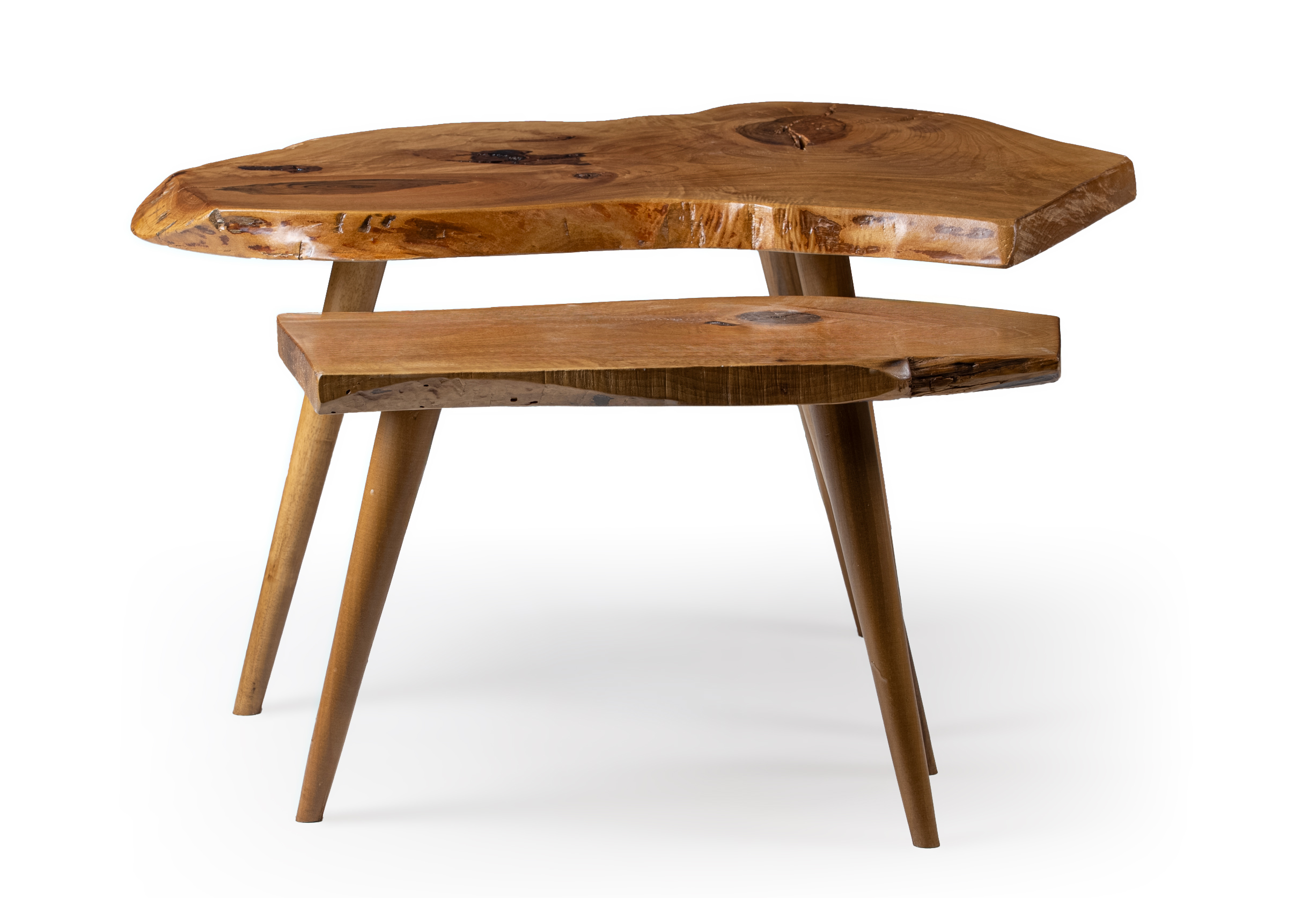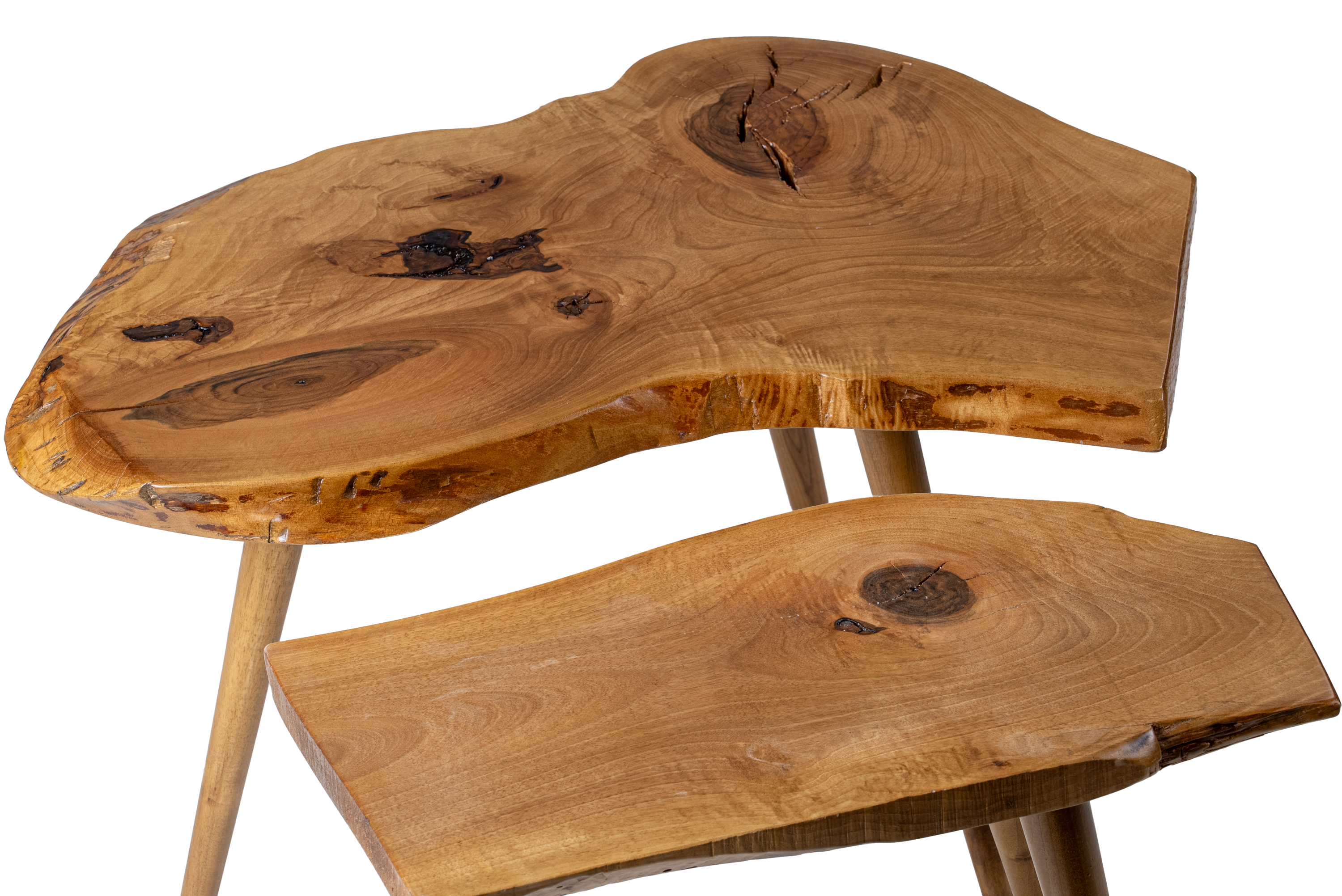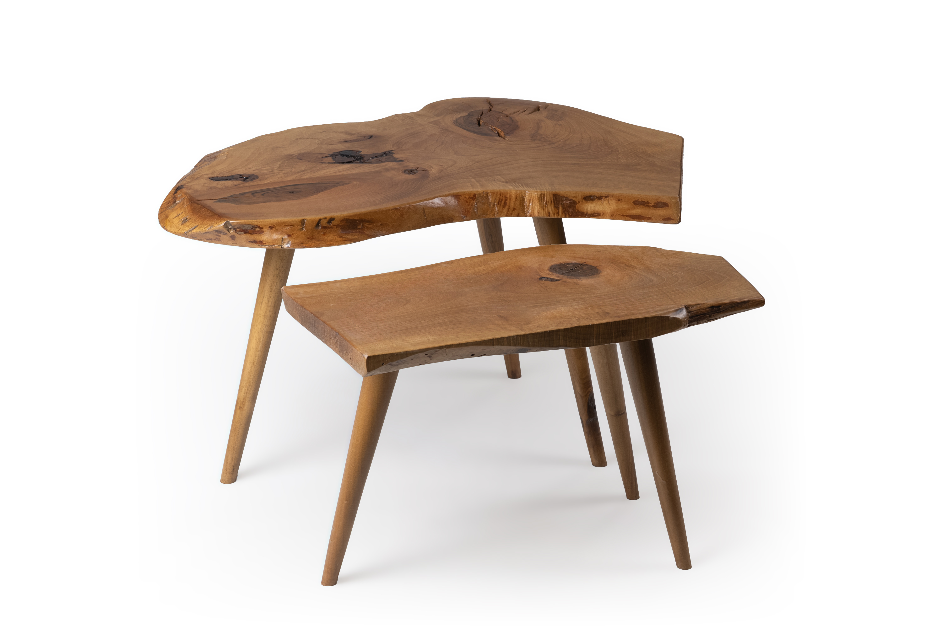 The Masif walnut 21 side tables set is a distinctive creation made from authentic solid walnut wood, designed to bring warmth and natural elegance to any interior. Each piece features a solid walnut top with organic curves and unique wood grain patterns that highlight the beauty of the natural material.